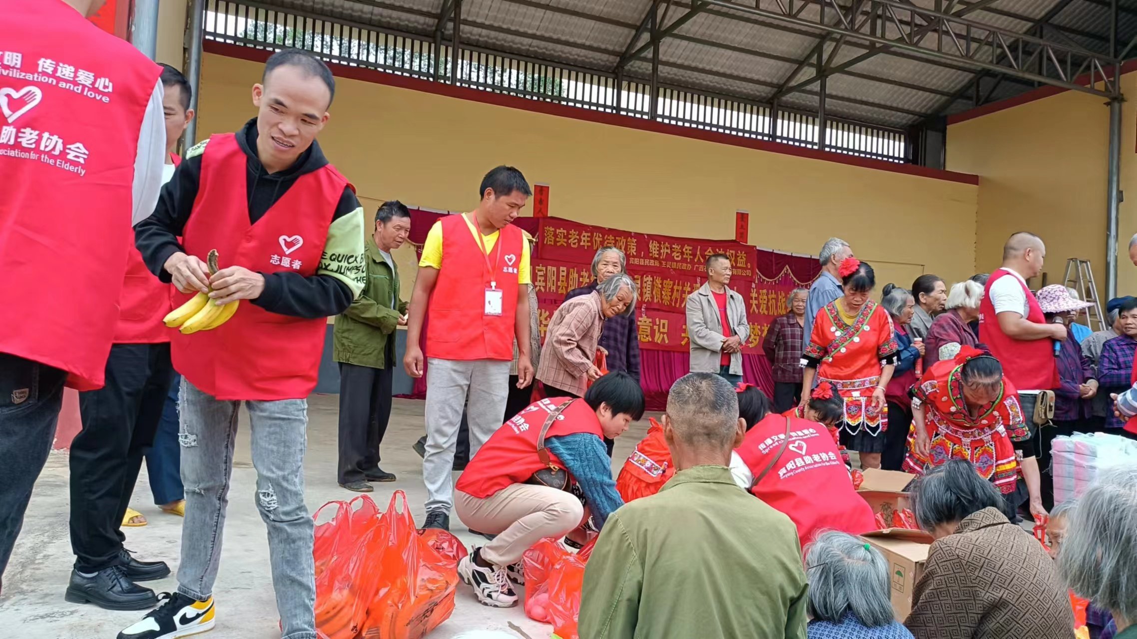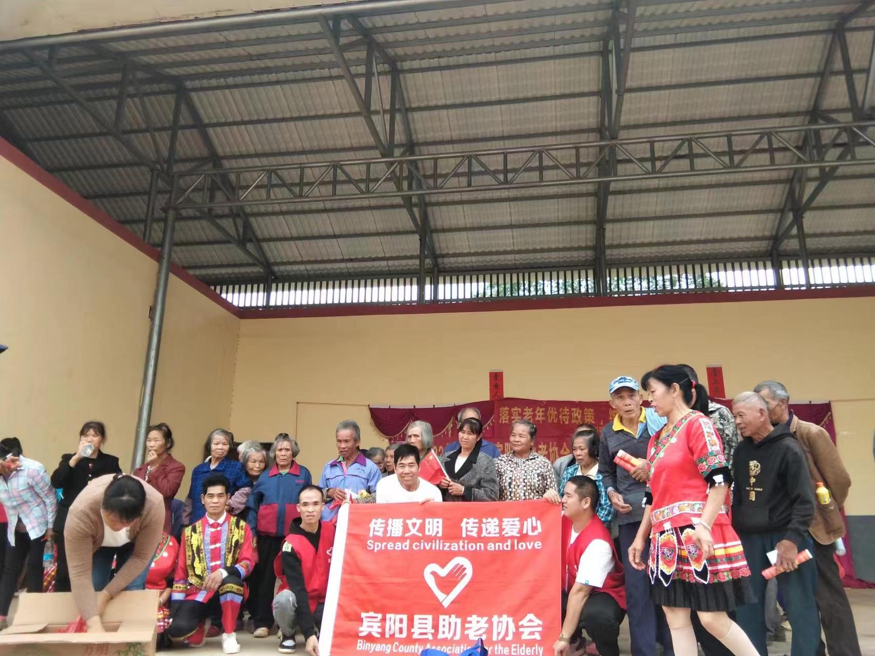 2023年11月8日宾阳县民政局、宾阳县助老协会、王灵镇民政办,广西石湖商务咨询有限公司、宾阳桂宾医院,王灵镇横寨村夕阳红文艺队,一行人走进王灵镇横寨村开展公益活动关爱高龄老人,关爱退役老兵,传承孝老爱亲中华美德,营造尊老敬老养老助老的文明新风尚,传递正能量。