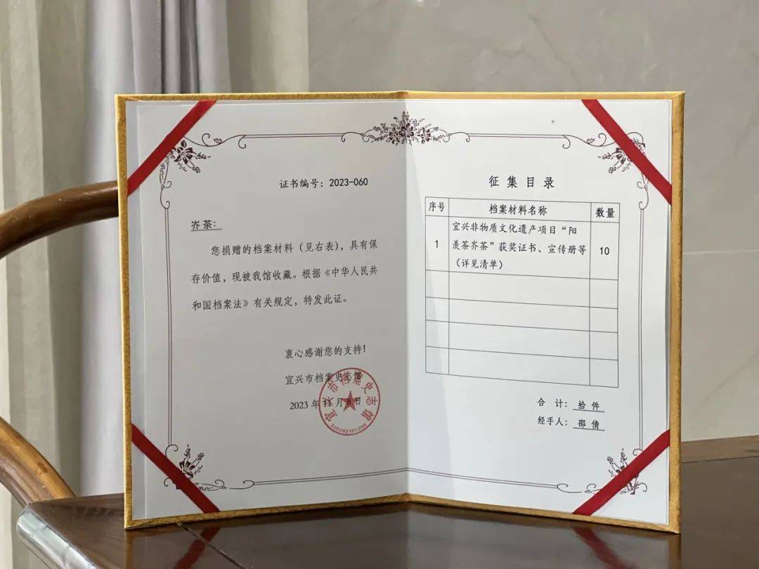 11月8日,无锡陶都岕茶股份有限公司向宜兴市档案史志馆捐赠了非物质文化遗产项目“阳羡岕茶”的获奖证书、宣传资料等10份文件,受到了宜兴市档案史志馆的衷心感谢。 李董说,非物质文化遗产是中华优秀传统文化的重要组成部分,也是中华文明绵延传承的生动见证。捐赠这些文件资料有助于保护和传承“阳羡岕茶”这一非物质文化遗产,维护和弘扬其独特的文化价值。这些资料是“阳羡岕茶”历史和文化的重要见证,对于后人了解和研究这一非物质文化遗产具有极高的价值。通过这些资料,公众可以更深入地了解“阳羡岕茶”的历史、制作技艺、文化内涵等方面的知识,增强对非物质文化遗产的认识和尊重,提高文化素养。 李董指出,“阳羡岕茶”是宜兴的地方特色文化,也是宜兴的一张文化名片。这些文件资料的捐赠,将有助于宜兴地区的内外文化交流,从而促进宜兴经济社会事业的发展。