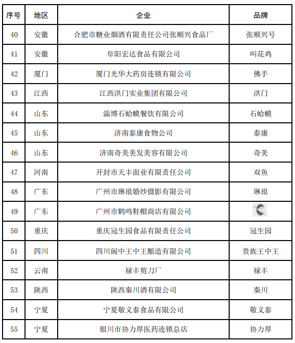 近日,商务部网站发布《商务部等5部门关于公布中华老字号复核结果的通知》,将长期经营不善,甚至已经破产、注销、倒闭,或者丧失老字号注册商标所有权、使用权的55个品牌,移出中华老字号名录;对经营不佳、业绩下滑的73个品牌,要求6个月予以整改;继续保留1000个经营规范、发展良好的品牌。 55个没有通过中华老字号复核的品牌包括北京的华女、雪花、通三益、TP、新路春,天津稻香村、重庆冠生园、上海老半斋等。