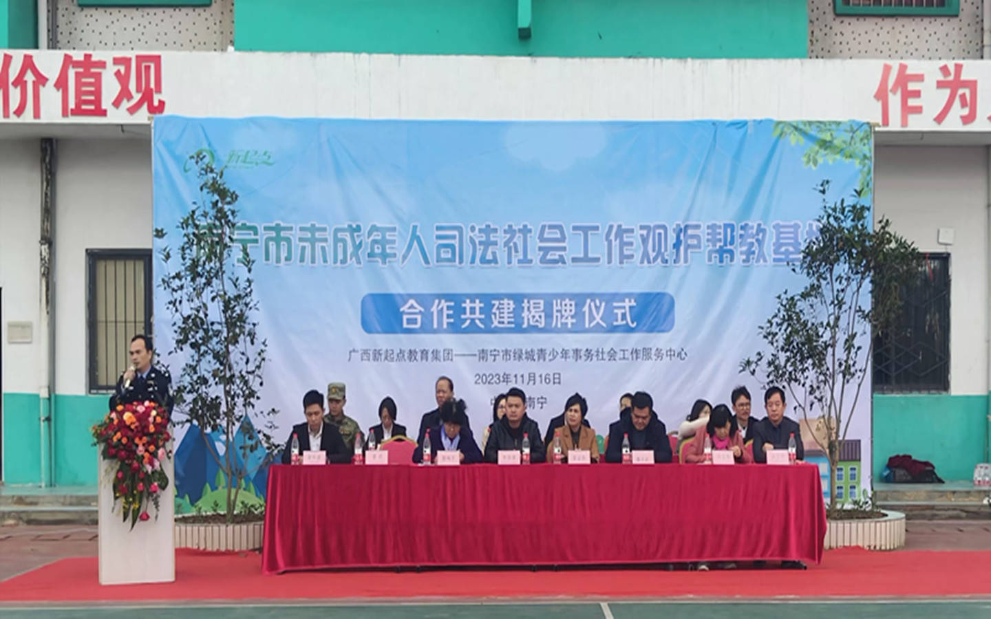 11月 16日,“南宁市未成年司法社会工作观护帮教基地”正式落户南宁市兴宁区五塘镇广西新起点励志教育集团。这是南宁市绿城青少年事务社会工作服务中心与广西新起点励志教育集团携手共建的成果,旨在立足实际,从家庭、学校、社会多方面多角度出发,不断加强双方在青少年事务领域的合作交流,为未成年人提供更加全面、有效的帮教服务,促进南宁市青少年心理健康发展,进一步推动南宁市未成年司法社会工作的规范化、专业化和科学化。