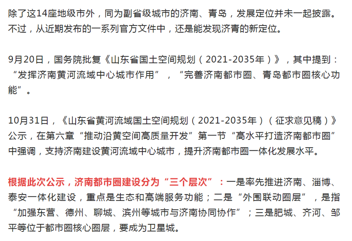 11月2日,山东省人民政府正式批复了淄博等14市的国土空间总体规划(2021-2035),有7座城市被赋予“中心城市”的定位。作为副省级城市,济南、青岛国土空间规划暂未批复。不过,从近期发布的一系列官方文件中,还是能看到济青的新定位。 在山东14市市级总规(2021-2035)中,有7座城市被赋予“中心城市”定位,分别是临沂、潍坊、淄博、德州、枣庄、东营、滨州。 从类别来看,临沂、潍坊、淄博、枣庄可以归为区域中心城市;德州、东营、滨州则是国家战略的中心城市,关联黄河流域生态保护和高质量发展。 ![]() ![]() ![]()
