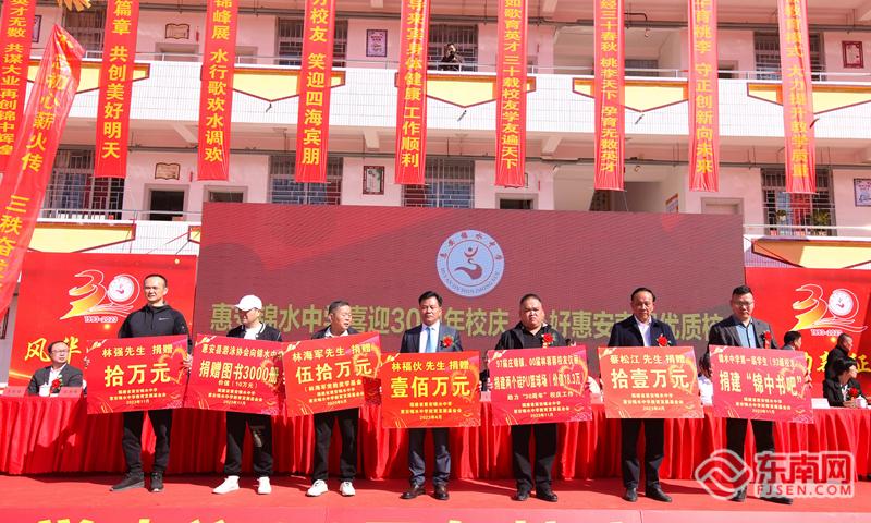 11月18日,福建省惠安锦水中学举办了办学30周年校庆活动。活动以“风华三十春 建功新征程”为主题,惠安县、螺阳镇等相关部门领导,社会各界乡贤、学校师生、家长代表、校友代表等齐聚一堂,庆祝学校30华诞,共话学校发展。 三秩芳华传薪火,携手同心庆华章。锦水中学地处侨乡螺阳镇锦东村,东依风景秀丽的灵山,西傍林辋溪。多年来,学校的建设发展得到了广大华侨、社会贤达和校友的大力支持,社会乡贤捐款捐物多达1013万元,其中爱国华侨林炳辉先生和林钰锟先生先后分别捐赠685万和173万元。如今,学校从1993年初办时的2个教学班,逐步形成初具规模的独立农村校,教育教学质量呈现良好向上的发展态势,先后被评为福建省义务教育管理标准学校、泉州市绿色学校、泉州市乡村温馨校园,为惠安农村初中教育发展提供“锦水样板”。 ![]() 活动现场。锦水中学供图 惠安县委常委、副县长蒋舒翔在致辞中指出,学校的发展离不开历任校长和老师们的辛勤奉献,离不开社会各界乡贤、校友的支持和关爱。希望锦水中学持续抓好教育教学质量,更好地凝聚海内外校友乡贤力量,努力办好高质量、有特色的人民满意学校;希望老师们紧跟教育现代化发展的步伐,用情用智帮助每一名学生成长成才;希望同学们秉承“厚积薄发,内外兼修”校训,在求索中加强修养、锻炼品格,努力成为有理想、敢担当、能吃苦、肯奋斗的新时代好青年。 惠安螺阳镇人大主席李锡铭在致辞中表示,近年来,锦水中学认真贯彻党的教育方针,以办“群众家门品的优质校”为奋斗,在众多乡贤的慷慨解囊下,强化学校管理,改善办学条件,深化教育教学改革,学校办学水平得到了全面提高,赢得了社会各界的广泛赞誉,也开启了学校发展的新篇章。 “今天我们以母校为傲,明天母校以我们为荣。”锦水中学1997届校友代表黄颖在发言中表示,怀着感恩的心情回到母校,深感自豪能够成为学校的一分子。非常难忘在母校度过的三年美好时光,感谢学校及老师为同学们提供了优质教育,这里不仅是知识的殿堂,更是我们人生成长的摇篮,今后将会以实际行动回馈母校,为学校的发展添砖加瓦。 ![]() 捐资助学授牌仪式。锦水中学供图 惠安锦水中学教育发展基金会理事长林福伙在致辞中表示,学校的30年发展历程,是一部充满奋斗和拼搏的历史,感谢所有为学校发展付出辛勤努力的老师们、乡贤们、校友们,希望学校在未来的日子里,能够继续坚持以人为本的教育理念,为社会培养更多的优秀人才。 不忘初心薪火传,三秩奋发谱华章。惠安锦水中学党支部书记、校长梁哲理在致辞中表示,30年的风雨历程,学校坚持立德树人,全面实施素质教育,秉承以“学生喜欢,家长放心,社会满意”的办学目标,突显“以德育德,以智启智,以美塑美”的办学理念,为社会培养了一批批优秀人才。在喜迎30周年校庆之际,学校将继续积极培养教学名师,开展学生良好的行为习惯养成教育、课堂教研活动,倡导构建“有效课堂”教学,办好惠安南翼“群众家门口的优质校”。 ![]() 学生文艺表演现场。锦水中学 供图 庆祝活动现场,还举行了捐资授牌仪式,学校向慷慨解囊、支持学校发展的社会各界爱心人士、乡贤、校友代表等授予荣誉奖牌。同时,还举行了一场文艺演出,学生们用歌声和舞蹈表达了对学校的热爱和对未来的期待。 “30周年校庆活动不仅是对过去30年发展的回顾,也是对未来发展的展望。我们相信在各级部门、各界人士的关心和支持下,学校将会有更大发展并为社会培养更多优秀人才。”校长梁哲理说。 ![]() 锦水中学教师团队。锦水中学供图 ![]() 捐资助学授牌仪式 锦水中学供图 ![]() 嘉宾参观校史馆。锦水中学供图 |