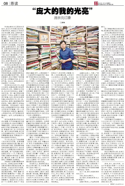 后来到过余亮的家乡古城兴化。好像也是沾染雨意的夜晚,由余亮带领,走在石板铺地的狭窄街道内,从四面八方弥漫而来的夜色里,我清晰感受到这座古城吐露的独特气息。潮湿的黑暗中,我似乎嗅到了施耐庵的气息、刘熙载的气息、毕飞宇的气息。在兴化,我和余亮的好友金倜兄一见如故。 我还到过兴化的沙沟,及其沙沟学校,这是庞余亮文学世界的源头和上游。寂静的乡村学校,校外的河流和码头,哺育了他的文学。我一直记得学校旁边的那个水码头,余亮对它也是深怀感情,他说,那时的他常常和镇上邮电所的工作人员一起,站在码头,等待从县城随船而来的邮包。“遇到大雾天气,邮船会来得很晚。但和邮递员一起拆邮包上的锡封是很快乐的,就像今天的孩子拆盲盒一样——说不定新来的《诗歌报》《童话报》上有我的作品,说不定有新的用稿通知。当然,也有退稿的沮丧。” 我和余亮具有共同的乡村成长背景,对于艰辛复杂的中国乡村底层生活,各自均有着深入骨髓的感受。这种生活和感受,就我们而言,既是烙痛内心的血块,更是强力的、他人所无的滋养。缘于此种共同背景,我们彼此间的理解与呼应,似乎并不特别需要借助言语,而更接近于一种血液般的天然相识。 可以说,我见证了庞余亮整个的文学创作历程。余亮有着极其丰沛强劲的创造力量,我们的相识缘于诗歌,但我亲眼目睹他激流般旺盛的创作力,溢出诗歌之河,汹涌漫流至文学其他领域的图景。除了他热爱的诗歌,余亮还涉足——不,不是涉足,而是以其真诚朴野的蛮力,侵略进儿童文学、长篇小说、散文的园地,闪展腾挪,攻城略地。 诗歌是为他最早赢得名声的文体。获得过在民间有着广泛影响的柔刚诗歌奖的余亮,写诗很早。20世纪80年代中后期,在全国各大诗刊上就经常可见庞余亮的身影。早期“遭遇”余亮诗歌印象最深的一个镜头,那是大学毕业前夕的1990年,我和另外两个同学逃课从苏州去河南看黄河。路经徐州时,在街头的一个小邮局内,我买了一本当期的《星星》诗刊,上面就读到了一大组我早已知道名字的“庞余亮”所写的有关玉米的诗歌。 似乎是从乡村出发的写作者的一个通例——余亮的早期诗歌题材以乡村为主,在那些沾带露水和麦穗颖芒的诗句背后,余亮表达着纯朴的“爱”的主题:爱亲人,爱土地,爱土地上健康生长的动物植物,爱像河流一样发蓝的天空。然而这终究只是一个阶段,随后,他的诗歌写作发生了令我吃惊的变化,宽广、驳杂、深痛,无论是题材的拓展,还是他所探触到的人性深度,都令我吃惊——黎明田埂上行走并且歌唱的单纯少年隐退了,较之早期透明的乡村之爱,他的诗歌已经完成质变,它复杂,沉重,多汁,无限近于生活本质的真实和滋味。众声喧哗的诗坛诗网之外,我见证过一位诗人的默默强大。 也许是因为有当过多年乡村教师的经历,余亮同时倾心于儿童文学创作,成绩斐然。他早期的童话作品《银镯子的秘密》,曾折全国童话金翅奖之桂;他的《小不点的大象课》,获首届曹文轩儿童文学奖。除此,像《顽童驯师记》《我们都爱丁大圣》《躲过九十九次暗杀的蚂蚁小朵》等等,都收获了无数小读者的喜爱。 最近一个时期,余亮在他的儿童文学作品中,首创了一个“左右左”形象,他的“神童左右左”系列,已经接连推出《无敌三剑客》《冷老师驾到》《“愚蠢”的史蒂夫》《跟着神童左右左写日记》等数部。我知道他没有说出的野心,他的“左右左”,要和郑渊洁的“皮皮鲁”一较高下。余亮非常勤奋,在一次一同前往西安的夜间绿皮火车上,他说今天在车上还要写一节“左右左”,这是他每天给自己定的任务。 到目前为止,庞余亮已经出版过三部长篇小说,分别是《薄荷》《丑孩》《有的人》。 作为“十月长篇小说创作丛书”推出的《薄荷》,是诗人庞余亮的第一部长篇。《薄荷》营造的艺术空间叫“三汊港镇”,那是一个城市户口和农村户口人群杂居的水乡古镇,时间跨度从上世纪80年代至新世纪开始,主要人物有三个,即王丽萍、林翠香、刘琴,小说的叙事过程,也即她们从女孩到女人的过程。三位主人公从一出生就面临着命运带给她们的挑战:农村户口、女性。她们初中没有毕业,就都陷入了命定的挣扎——其实,和她们一样不甘和奋斗的,还有三汊港镇上其他形形色色的女人,她们忍受着屈辱,用女人自己的武器去抗争,但她们一个接一个地失败了。王丽萍是小说的一个中心人物,她在经历了一系列生活给她的骗局之后,不再躲避,开始理解和面对残酷而真实的生活——泥沼般的生活中,刘琴和林翠香们先后沉沦,只有像王丽萍式的坚韧者,还在顽强并且奋力地跃出身子,仰面呼吸。长篇小说《薄荷》的诞生,标志着先前以诗闻名于文坛的庞余亮,在他自我的文学攀登过程中,到达了一个新的高度。 《丑孩》有半自传色彩。丑孩三歪子,自己也承认长得丑,只能和小黑狗、丑板凳共用名字。他一直都想证明自己是最有价值的人,于是一次次用“怪招”来证明自己,但每一次都以失败告终,结果尴尬四起、洋相百出,令人捧腹大笑又眼含泪水。在寻找美和爱的路上,丑孩渐渐长大了,蓦然回首,每一个充满泥腥气的诙谐故事,都是一次有意义的蜕变。有评论称,《丑孩》是中国农村版《淘气包日记》,中国式的《童年》,是一部献给大人也献给孩子的苦难小说。 对于长篇小说《