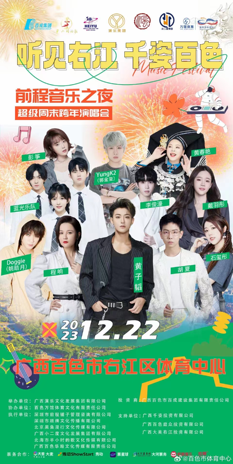 12月22日,百色市将在右江区举办“听见右江 千姿百色”前程音乐之夜超级周末跨年演唱会。届时,黄子韬、胡夏、黄春艳、程响等13位国内知名艺人相继在晚会献唱。