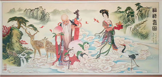 彩墨着仕女,素笔勾青花,2018年方万祥为新宅镇岭脚村百鹿台绘制的福禄寿图完成,整幅图画几乎与戏台同高,远观也可看见画中人神态,衣着细节,可见作画者之用心。同时,完成的还百余只神态各异的麋鹿图泥水画,呼之欲出。 2021年10月,由金华市民协、武义宣传部,武义县文联,武义文化馆龙潭国画院等多家单位联合举办了别开生面的“工匠方万祥绘画个人展”,展览的作品涉及的题材丰富,形式多样,风格鲜明:情景山水画、人物工笔写意画、写意花鸟画等优秀作品。美术作品有气势宏大的山水画、有写意水墨人物画、写意花鸟画等。这次画展得到了书画界顶级专家和省、市、县各级有关领导的高度评价以及充分的鼓励与肯定,也得到了观众朋友们的赞誉与好评。