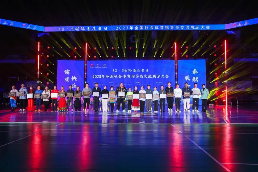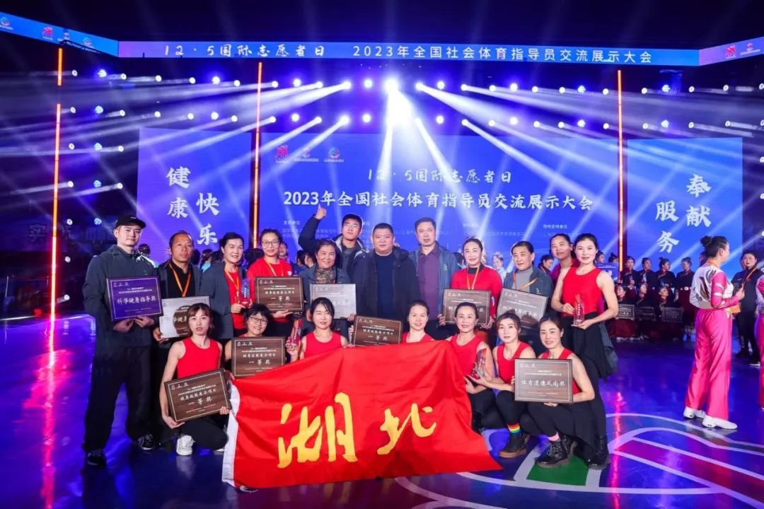 12月5日,“12·5 国际志愿者日”2023年全国社会体育指导员交流展示大会在上海市嘉定体育馆圆满落幕,来自全国21个省、自治区、直辖市的45支队伍、539名社会体育指导员欢聚一堂,交流展示健身技能,分享健身指导经验。在健身技能交流展示评选中,湖北省社体中心组队参赛的4支队伍获得4个一等奖,获奖数量排名全国第二,并在8个单项奖评选中累计获得 10项大奖,获奖数量排名全国第二;湖北籍评审员童胜玢获得“优秀评审员”称号;湖北省还荣获“2023年度社会体育指导员工作贡献单位”、“体育道德风尚奖”等奖项,取得了精神文明与比赛成绩双丰收。
