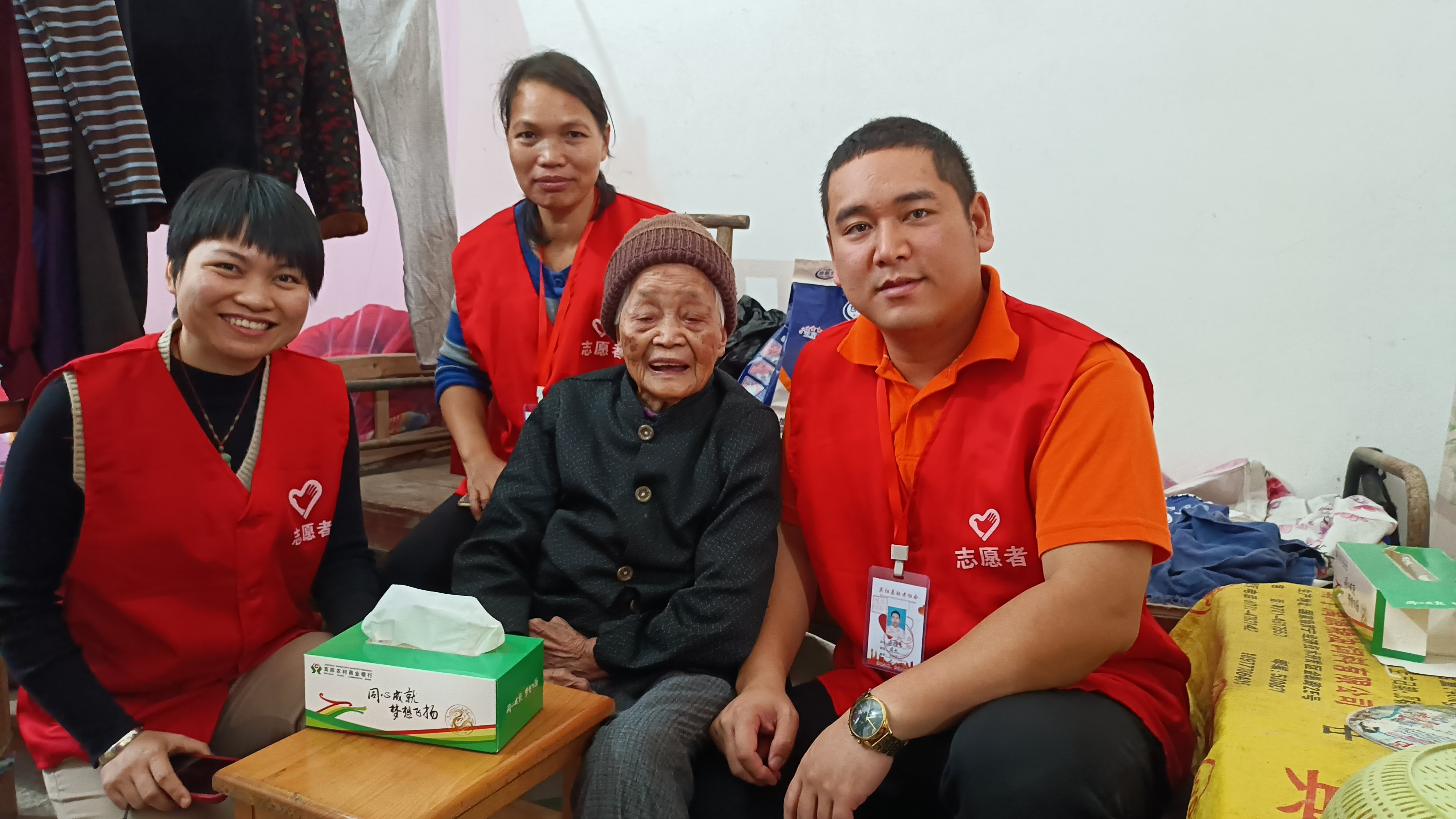![]() 2023年12月10日早上8点30分,宾阳县助老协会在宾阳县民政局门口集合,去宾阳县新圩镇周鸡村,看望101岁老人:卓服明(老爷爷),他总共有5个孩子,3个儿子,2个女儿,8个孙女,4个孙子,2个曾孙,3个曾孙女。身体状况:良好,生活能自理,耳朵听力有点差。现场量血压,高压:114,低压:65,心跳:82。 ![]()