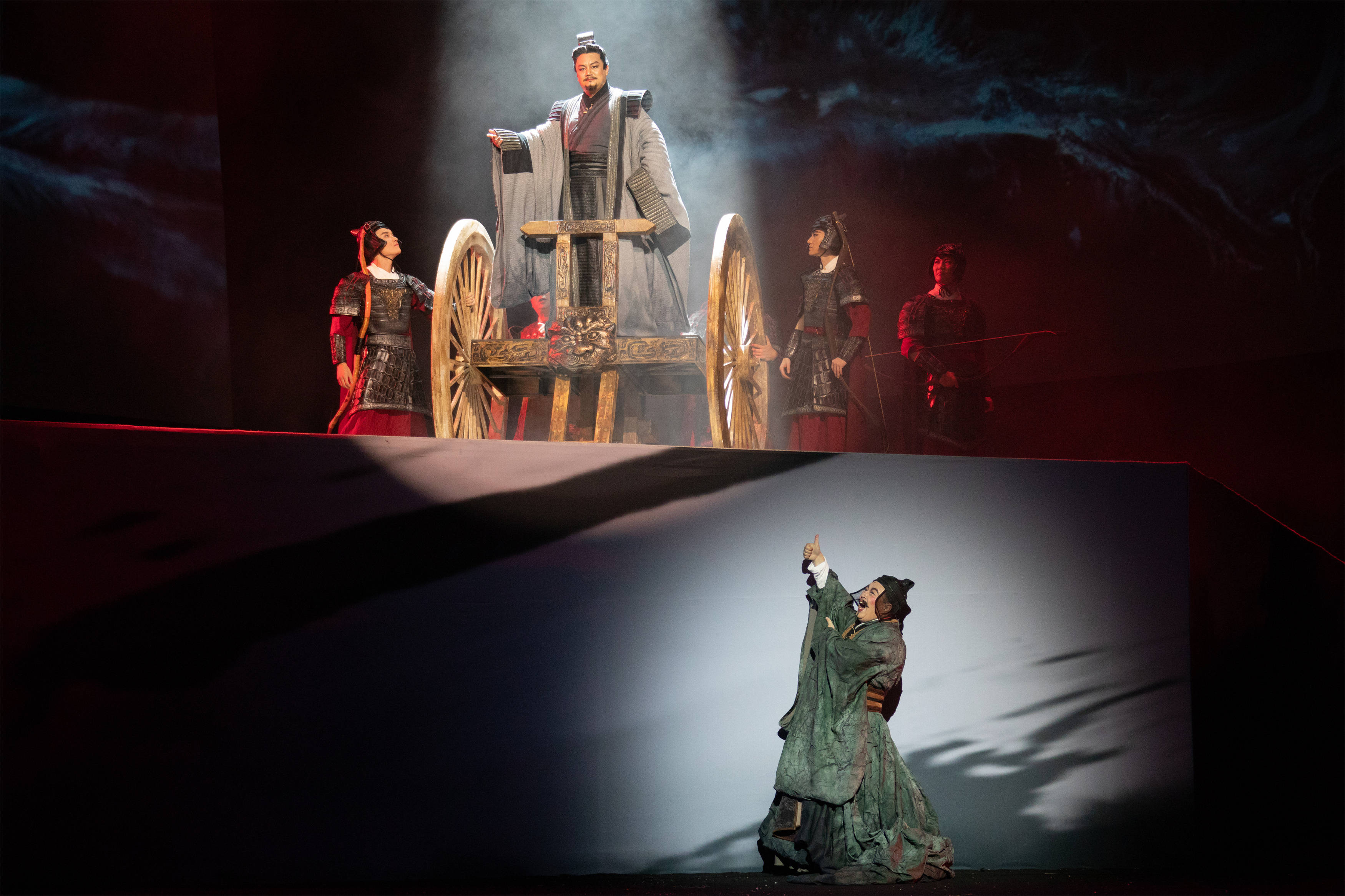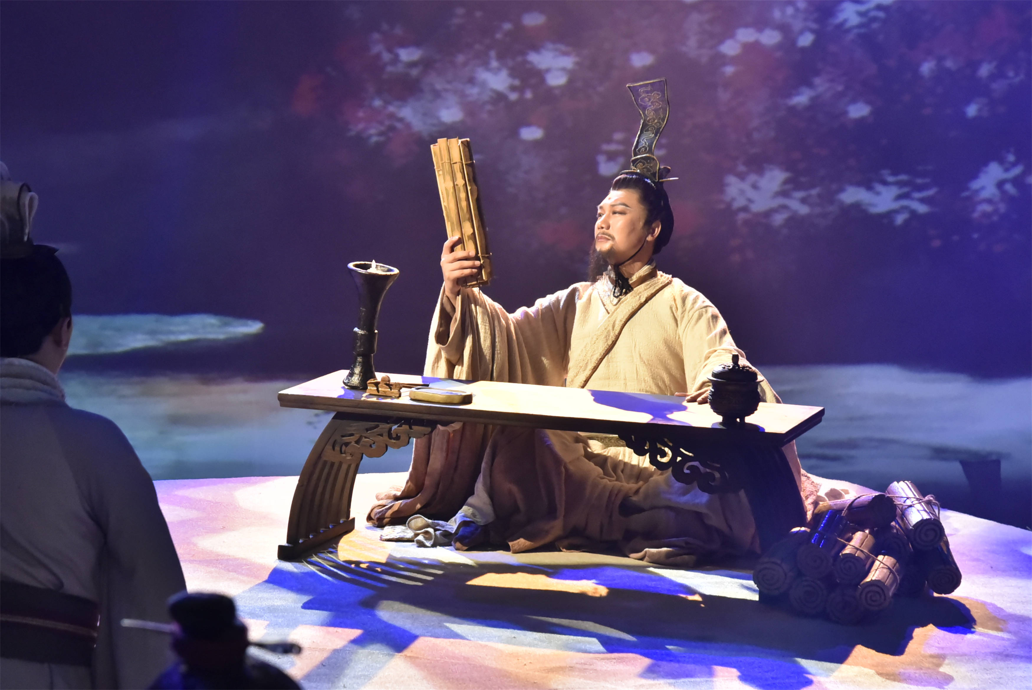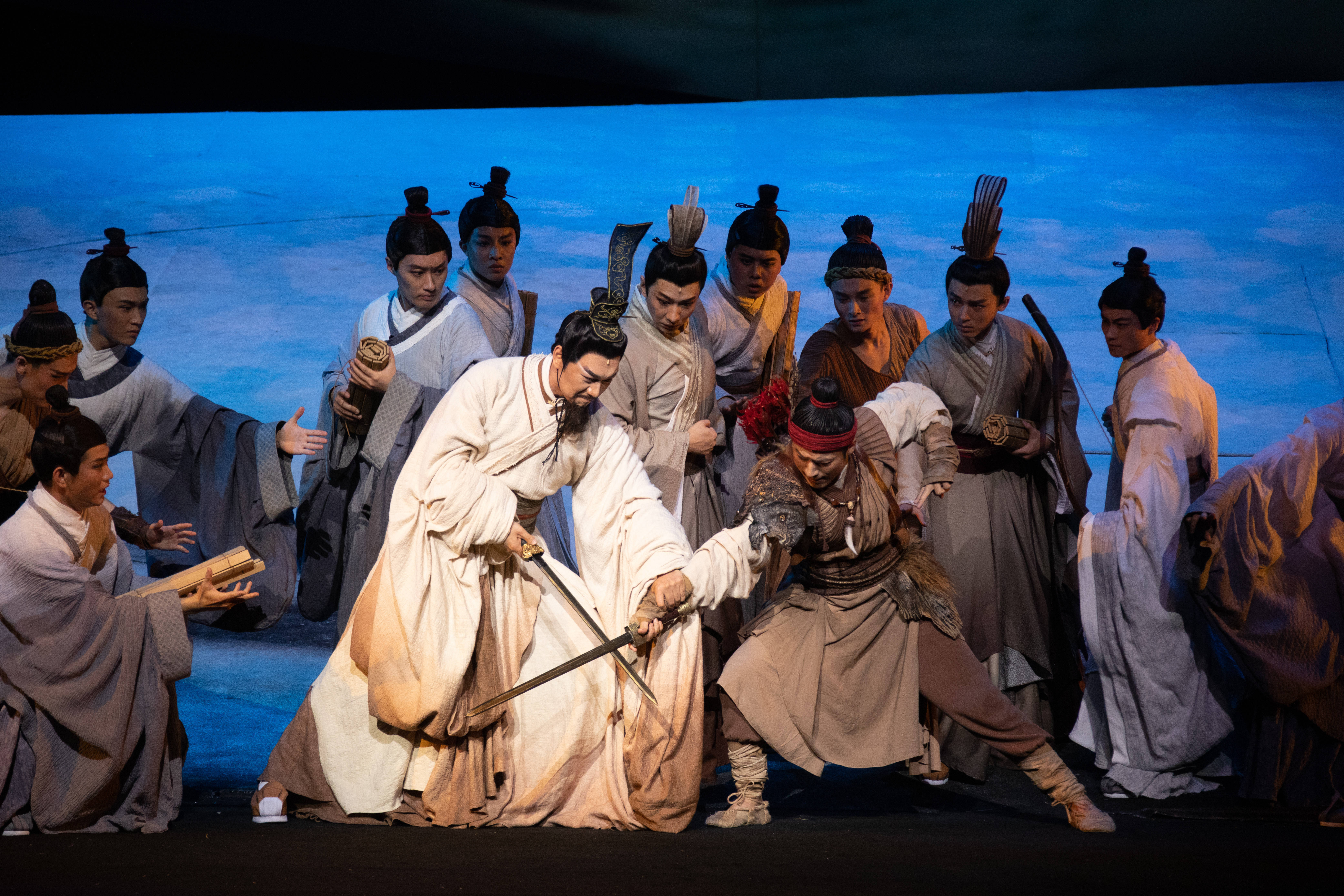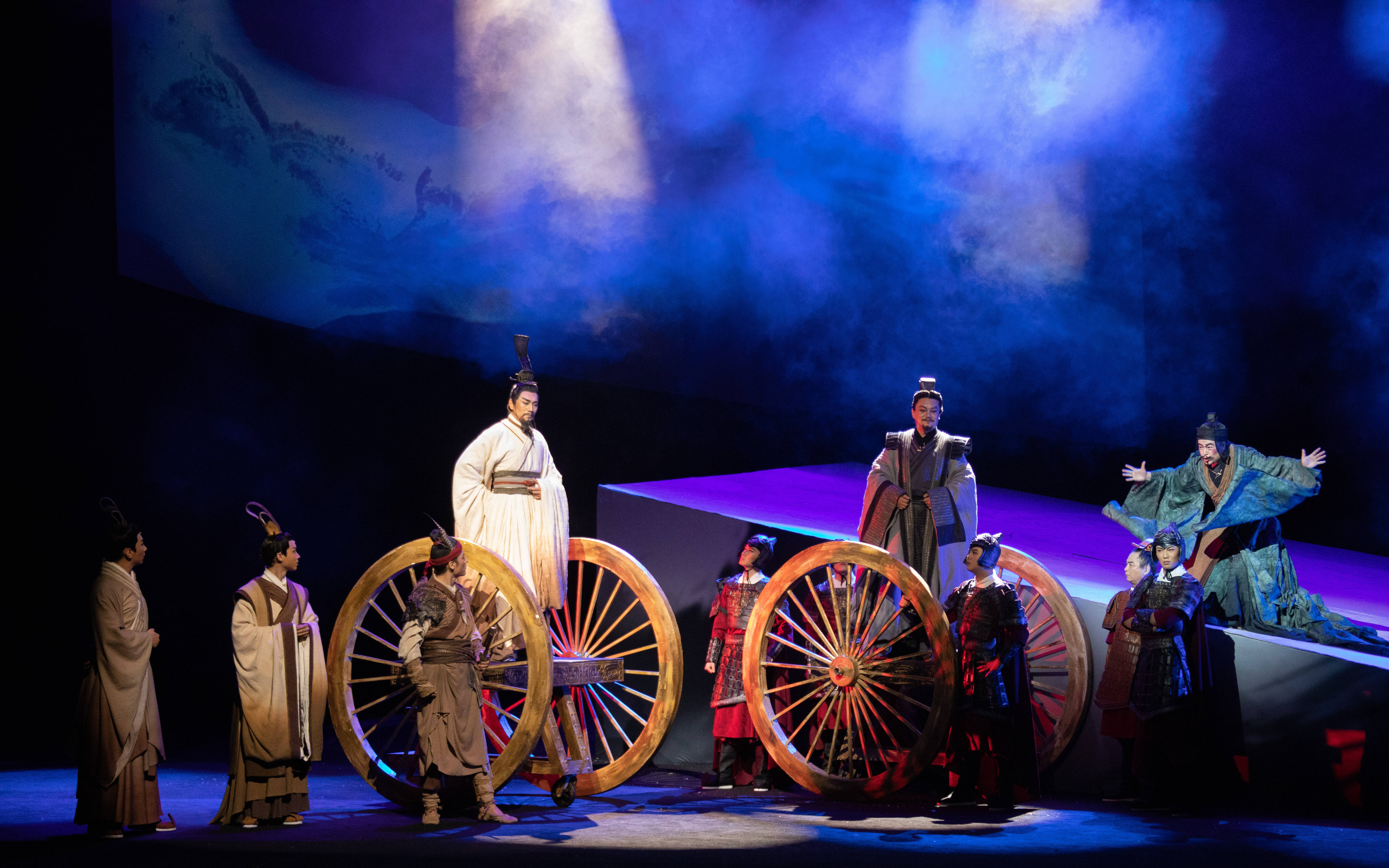 话剧《孔子》倾注了张继钢导演大量心血,它融合了音乐、舞蹈、诗歌、戏曲、雕塑等多元艺术形式,从不同角度,打破时空的局限,展示了以春秋时期为背景的宏阔场面,极大地拓宽观众对话剧审美的外延,让纯粹而至诚的精神力量形象生动,是优秀传统文化创造性转化、创新性发展的一次有益探索。 作品以春秋末期诸侯争霸为历史背景,揭示了社会变革中形色各异的人生选择,着力表现了孔子追求“大道之行,天下为公”的理想和“知其不可而为之”的精神境界,努力塑造出一个遥远而鲜活、高大而素朴、威严而亲切的至圣先师光辉形象,对于构建人类命运共同体意识具有重要的现实意义。 作品生动塑造了一位历经磨难不忘初心的圣人和一群坚定信仰追寻理想的贤人,讲述了孔子伟大、波澜壮阔而又坎坷、颠沛流离的一生。作品以思接千载的视野书写一部壮丽史诗,以视通万里的格局描绘一幅恢宏画卷,呈现出孔子璨若星河、烟波浩渺的伟大思想,热情赞颂了这位至今还在影响着世界的中国古代伟大的思想家、政治家、教育家。