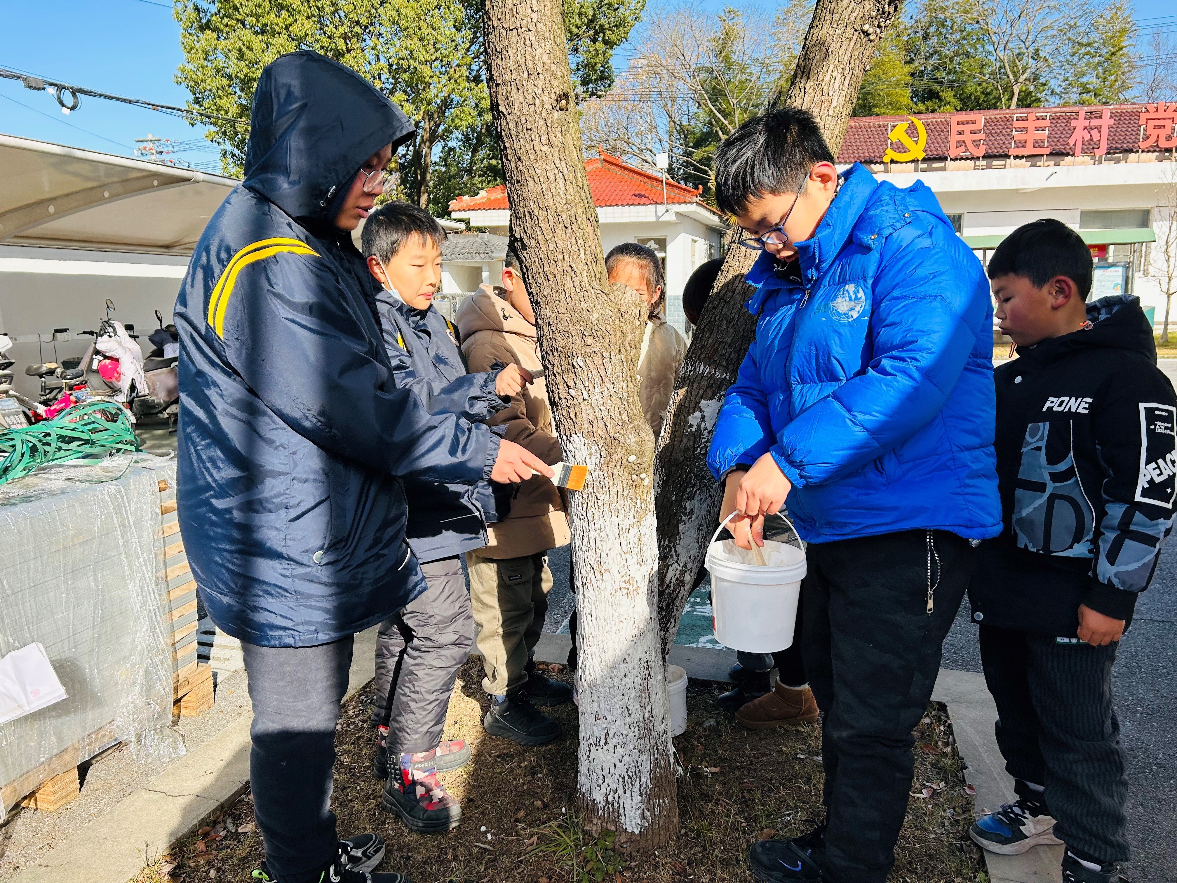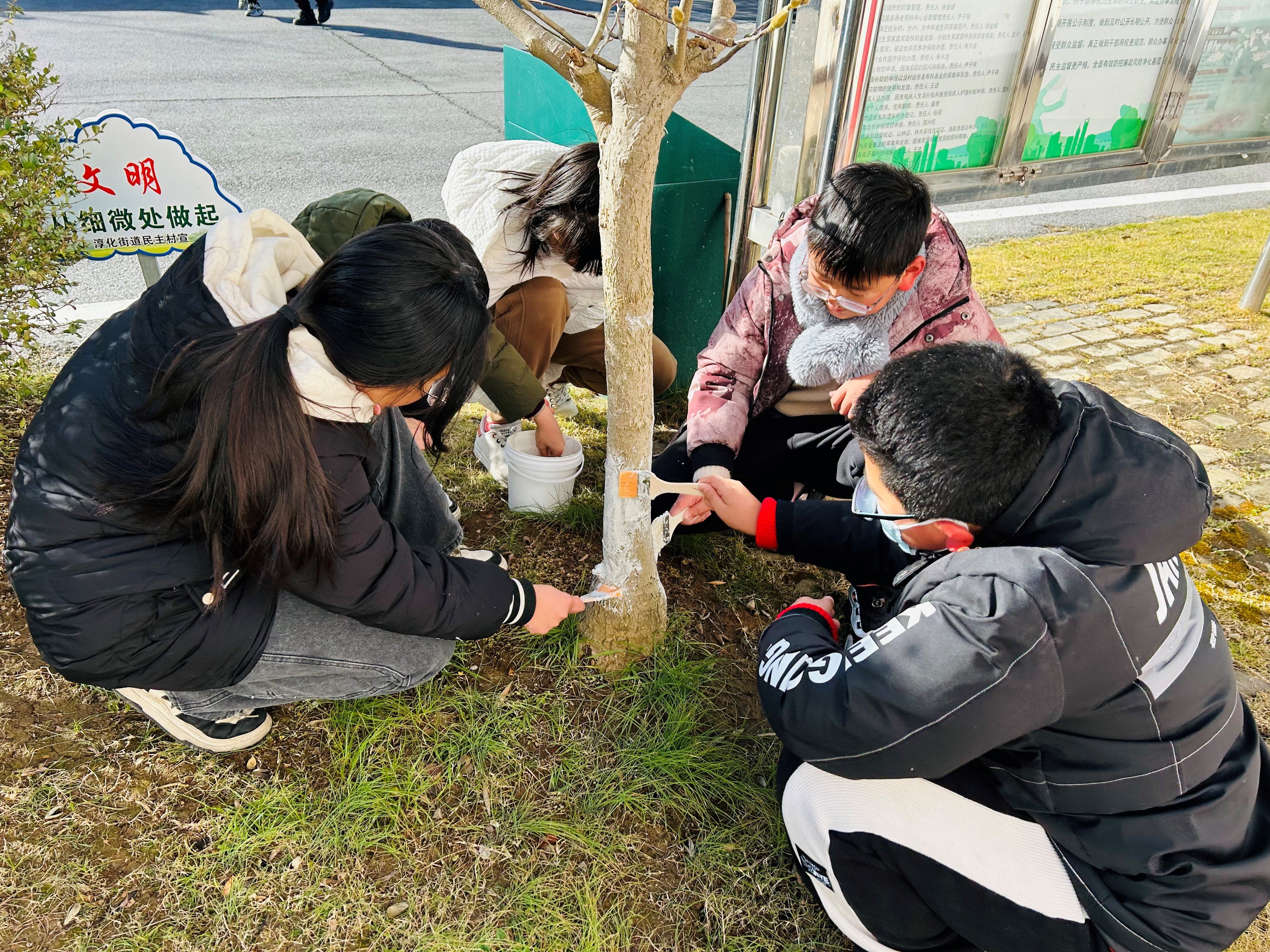 接着,孩子们在社工的带领下共同来到户外为小树穿上“冬衣”。社工为孩子们讲解到,冬天温度下降,为小树涂上白石灰,不仅能起到保暖效果,还能杀菌预防虫害。孩子们兴奋地拿着刷子,他们小心翼翼地为小树刷上“白衣”,确保每棵小树都得到温暖的保护。孩子们在这一刻化身成“小小环保公益人”,用自己的行动去关爱自然,他们的脸上洋溢着喜悦和满足,因为他们知道他们正在为保护环境做出贡献。