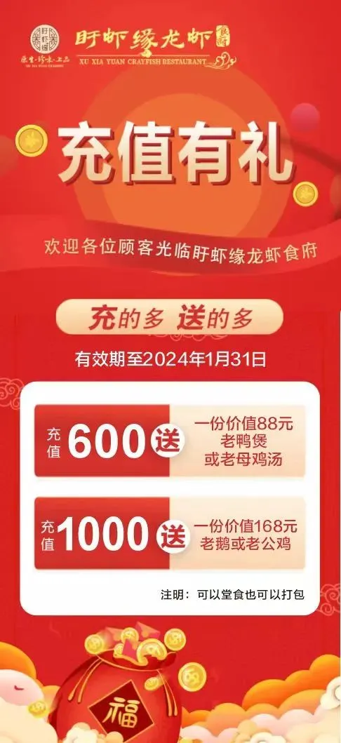 ![]() 你消费、我奖励,百万大奖、盱位以待!消费满200元以上即可参与抽奖!!! 羊肉火锅套餐,仅98元。含两斤鲜羊肉(羊排),两个冷盘,四道蔬菜。 三年以上老公鸡,杀好四斤半左右,特价168元/只。 山头散养老母鸡汤,原价138元/只,特价88元/只。 一年以上老鸭煲,88元/只。 以上美食均可外卖,城区免费送货上门! 充值有礼:充值600元,送老鸭煲或老母鸡汤一份。 充值1000元送老鹅或老公鸡一份。 盱虾缘龙虾食府欢迎您!13222711155王先生 ![]() ![]() ![]() ![]() ![]() |