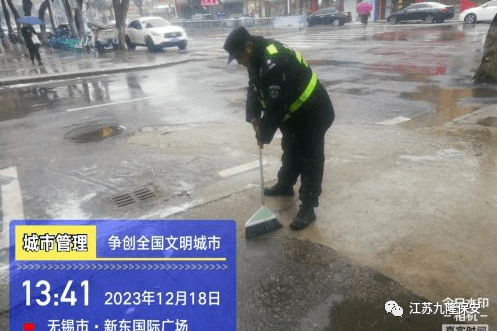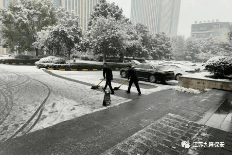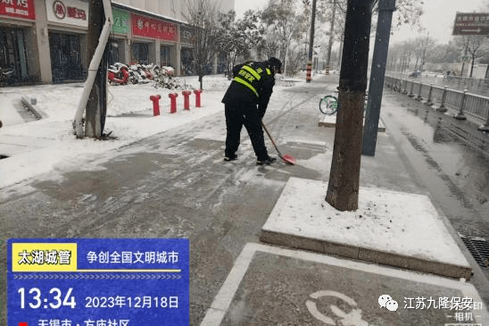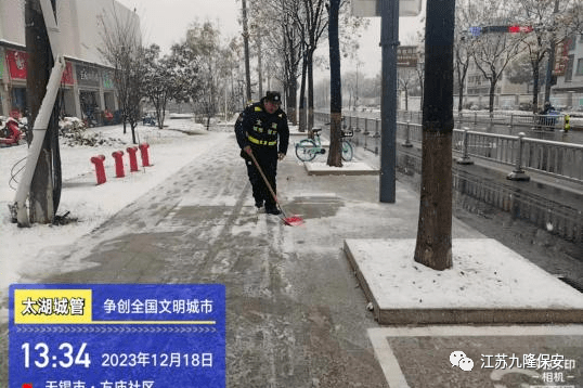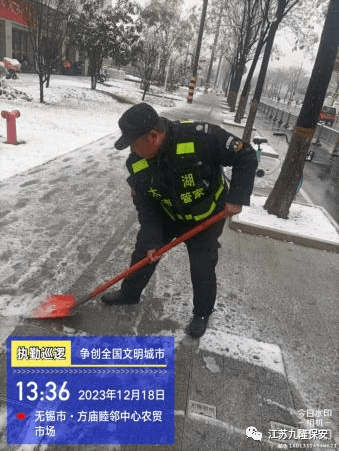 2023年12月18日,无锡迎来了一场大规模的降雪,给城市披上了一层银装素裹的美丽外衣。然而,这场美丽的雪景却给居民和公众的出行带来了不便。 为了保证公众的出行安全,江苏九隆保安服务有限公司营运网点保安员为方庙社区、南湖家园、方庙睦邻中心农贸市场、周新文化艺术街区等周边道路清扫积雪。