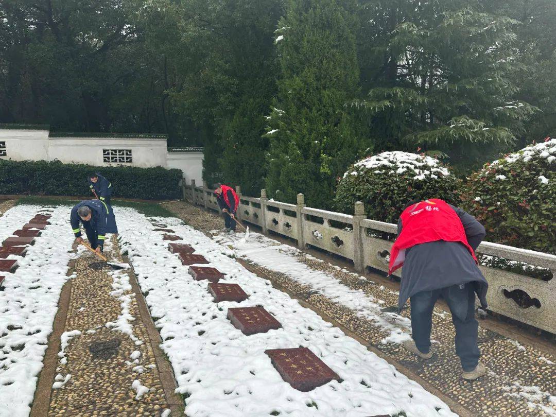 锡北春风村退役军人服务站组织退役军人志愿者到陵园烈士墓区扫雪。
