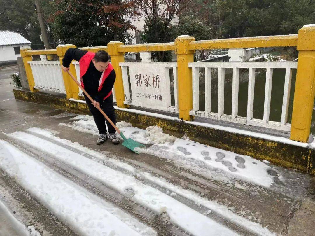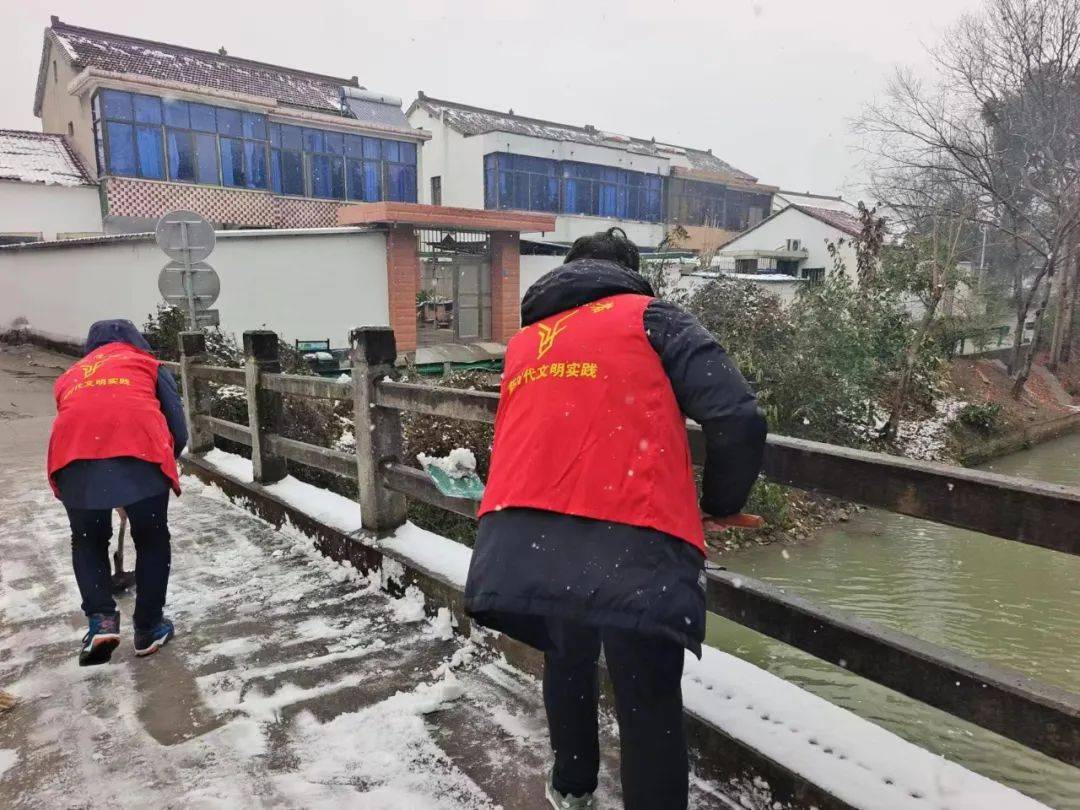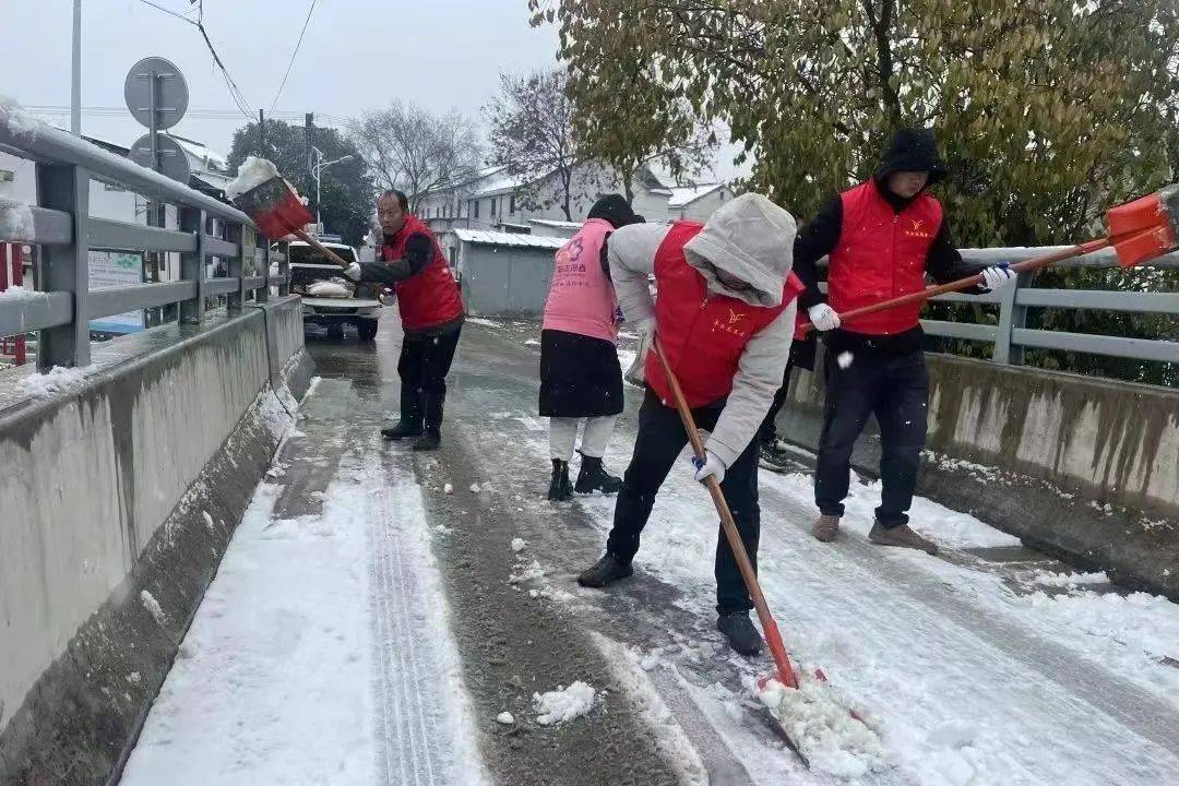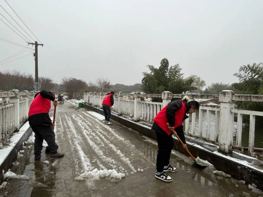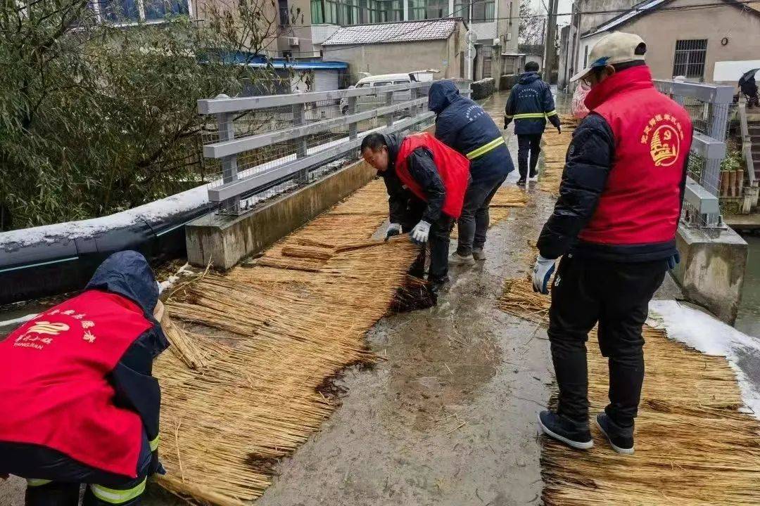 羊尖镇各村级服务站志愿服务队在村级主要路段、桥面清除积雪、铺设草皮,确保通行安全。
