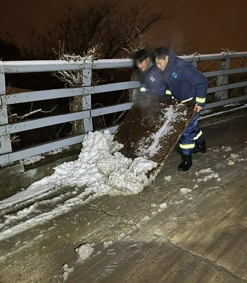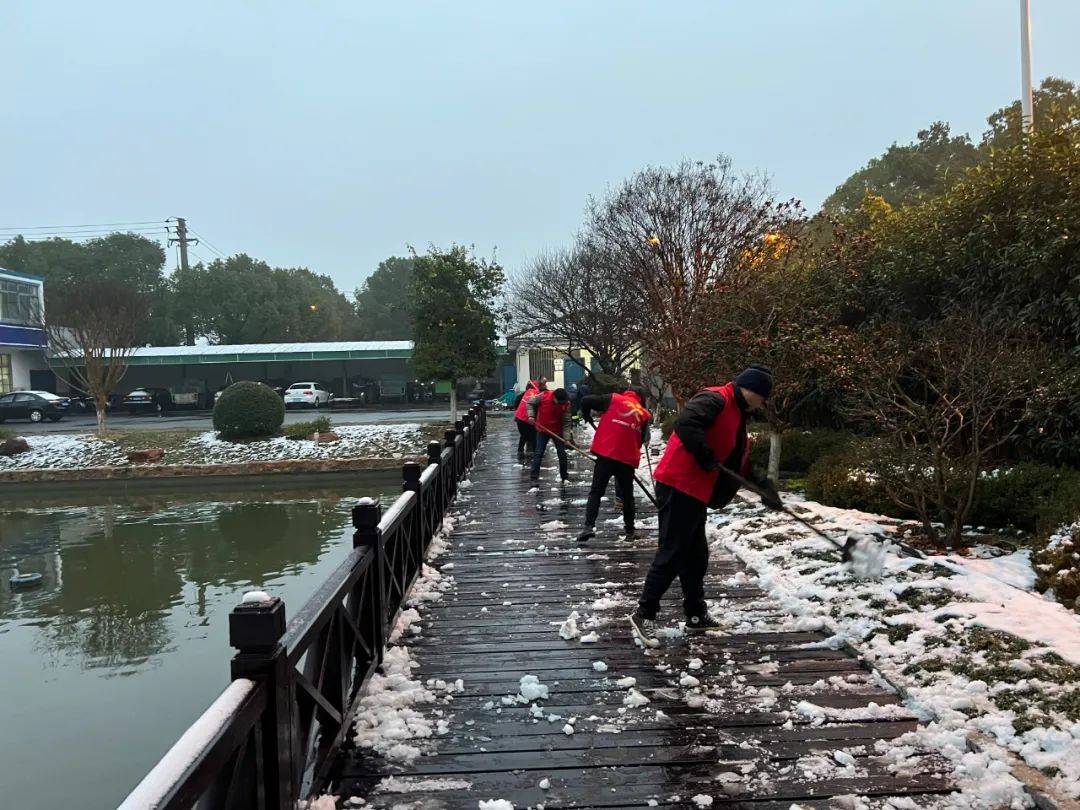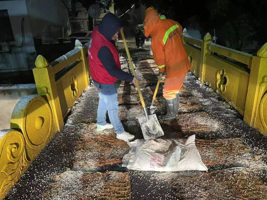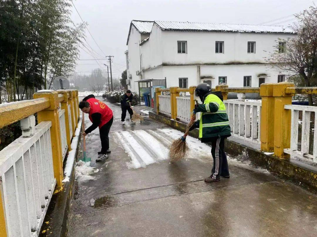 羊尖镇各村级服务站志愿服务队在村级主要路段、桥面清除积雪、铺设草皮,确保通行安全。