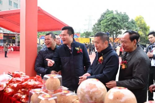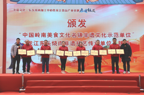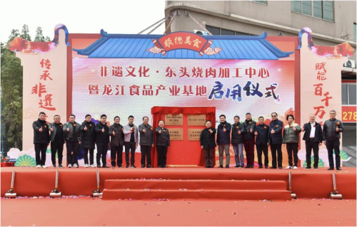 东头烧肉加工中心暨龙江食品产业基地揭牌启用(陈款华摄) 活动现场,领导嘉宾共同上台为“非遗文化·龙江东头烧肉加工中心”、“龙江东头烧肉菜式研究中心”、“龙江东头烧肉文化传承中心”、“龙江食品产业基地”揭牌并现场切烧肉。