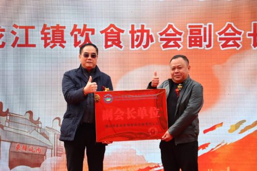龙江镇饮食协会会长谭学忠向佛山市东头东联食品管理有限公司颁发牌匾