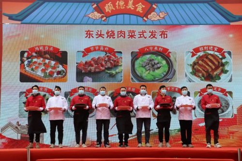 团区委书记陈智聪、龙江镇副镇长吴俊向进驻的六家优质商家颁发牌匾 随后,龙江饮食协会现场发布了精心研制的9道利用东头烧肉制作的菜式,为现场嘉宾领导奉上“美食盛宴”,展现了协会的龙江名厨精神。
