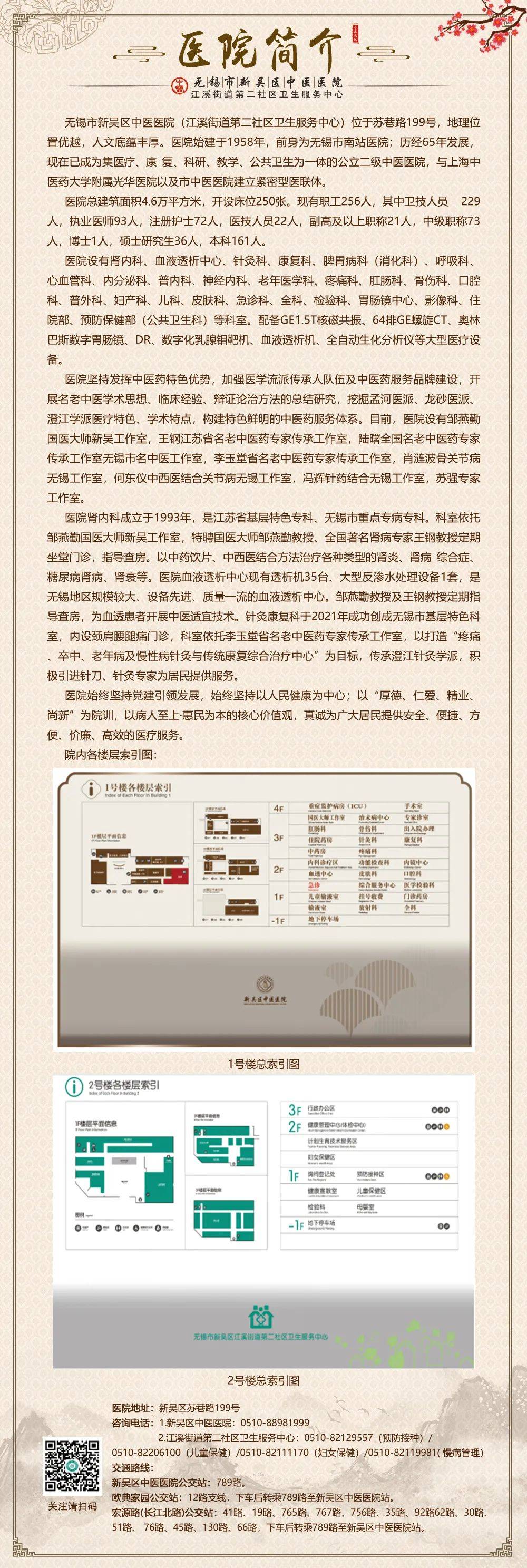医院简介 无锡市新吴区中医医院(江溪街道第二社区卫生服务中心) 无锡市新吴区中医医院(江溪街道第二社区卫生服务中心)位于苏巷路199号,地理位置优越, 人文底蕴丰厚。医院始建于1958年,前身为无锡市南站医院;历经65年发展,现在已成为集医疗、康复、科研、教学、公共卫生为一体的公立二级中医医院,与上海中医药大学附属光华医院以及市中医医院建立紧密型医联体。 医院总建筑面积4.6万平方米,开设床位250张。现有职工256人,其中卫技人员229人,执业医师93人,注册护士72人,医技人员22人,副高及以上职称21人,中级职称73人,博士1人,硕士研究生36人,本科161人。 医院设有肾内科、血液透析中心、针灸科、康复科、脾胃病科(消化科)、呼吸科、心血管科、内分泌科、普内科、神经内科、老年医学科、疼痛科、肛肠科、骨伤科、口腔科、普外科、妇产科、儿科、皮肤科、急诊科、全科、检验科、胃肠镜中心、影像科、住院部、预防保健部(公共卫生科)等科室。配备GE1.5T核磁共振、64排GE螺旋CT、奥林巴斯数字胃肠镜、DR、数字化乳腺钼靶机、血液透析机、全自动生化分析仪等大型医疗设备。 医院坚持发挥中医药特色优势,加强医学流派传承人队伍及中医药服务品牌建设,开展名老中医学术思想、临床经验、辩证论治方法的总结研究,挖掘孟河医派、龙砂医派、澄江学派医疗特色、学术特点,构建特色鲜明的中医药服务体系。目前,医院设有邹燕勤国医大师新吴工作室,陆曙全国名老中医药专家传承工作室无锡市名中医工作室,王钢江苏省名老中医药专家传承工作室,李玉堂省名老中医药专家传承工作室,肖涟波骨关节病无锡工作室,何东仪中西医结合关节病无锡工作室,冯辉针药结合无锡工作室,苏强专家工作室。 医院肾内科成立于1993年,是江苏省基层特色专科、无锡市重点专病专科。科室依托邹燕勤国医大师新吴工作室,特聘国医大师邹燕勤教授、全国著名肾病专家王钢教授定期坐堂门诊,指导查房。以中药饮片、中西医结合方法治疗各种类型的肾炎、肾病综合症、糖尿病肾病、肾衰等。 医院血液透析中心现有透析机35台、大型反渗水处理设备1套,是无锡地区规模较大、设备先进、质量一流的血液透析中心。邹燕勤教授及王钢教授定期指导查房,为血透患者开展中医适宜技术。 针灸康复科于2021年成功创成无锡市基层特色科室,内设颈肩腰腿痛门诊,科室依托李玉堂省名老中医药专家传承工作室,以打造“疼痛、卒中、老年病及慢性病针灸与传统康复综合治疗中心”为目标,传承澄江针灸学派,积极引进针刀、针灸专家为居民提供服务。 医院始终坚持党建引领发展,始终坚持以人民健康为中心;以“厚德、仁爱、精业、尚新”为院训,以病人至上·惠民为本的核心价值观,真诚为广大居民提供安全、便捷、方便、价廉、高效的医疗服务。 医院地址 新吴区苏巷路199号 交通路线 新吴区中医医院 江苏省无锡市新吴区苏巷路199号 新吴区中医医院公交站:789路。 欧典家园公交站:12路支线,下车后转乘789路至新吴区中医医院站。 宏源路 (长江北路公交站):41路、19路、765路、767路、756路、35路、92路62路、30路、 51路、 76路、45路、130路、66路,下车后转乘789路至新吴区中医医院站。 END