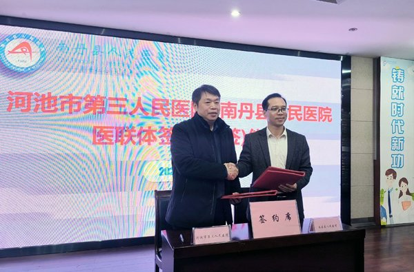 广西河池:两家医院在南丹举行医联体续签仪式 12月21日,“河池市第三人民医院——南丹县人民医院医疗联合体”续签仪式在南丹举行。河池市第三人民医院院长余永壮、副院长覃文报等领导及专家、南丹县人民医院中层领导干部及部分职工代表参加签约仪式。仪式由南丹县卫生健康局党组成员、南丹县人民医院党委书记覃候山主持,南丹县人民医院莫祝院长致欢迎辞。 ![]()