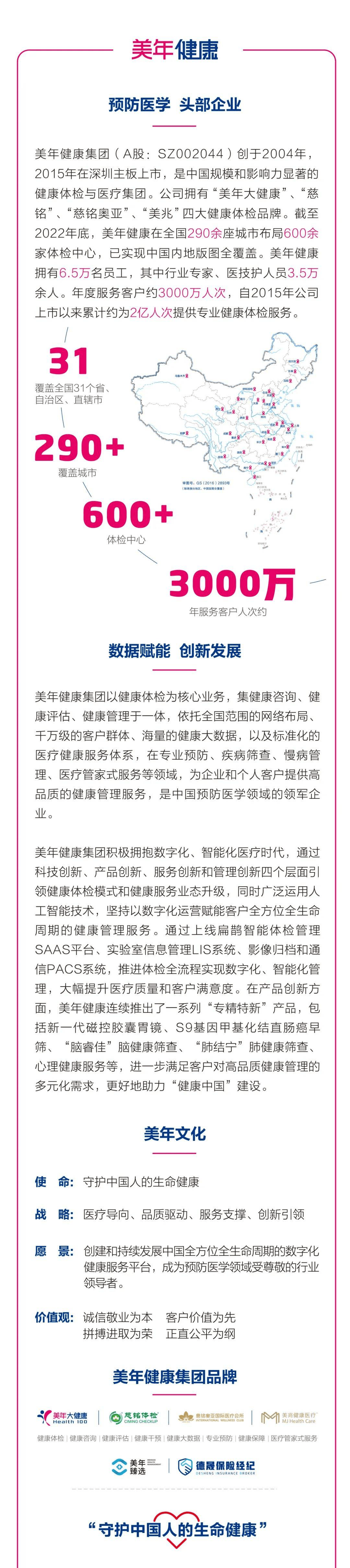 日月其迈,时盛岁新。在铿锵前行的脚步声里,2024年欣然而至,新年的曙光即将照亮苍穹。在这辞旧迎新的美好时刻,我谨向美年健康集团的同仁们、家人们恭贺新年!向各位合作伙伴以及关心、支持美年健康的朋友们致以节日的问候和新年的祝福! 2023年是科技行业的“大模型元年”,也是医疗大健康产业进入数智化时代快速发展的一年。ChatGPT的横空出世、人工智能(AI)和生成式人工智能(AIGC)快速进步,为推动健康中国高质量建设提供了强大的科技动力。这一年,美年健康在日新月异、奔涌向前的数字医疗浪潮中踔厉奋发,乘势而为,加速奔跑,全面提速数字化运营,持续加强产品创新力,进一步提升品牌形象,全面打造医质、服务、精细化运营的品质驱动体系,不断推进数智AI技术与医疗服务的深度融合和创新应用,为客户提供专业、有爱、个性化的全方位全生命周期的健康管理服务。 2023年消费医疗和健康服务强劲复苏,经过6万多名美年人的艰苦奋斗,美年健康交出了一份业绩强势回升、数字化转型加速突破、各项工作进入良性运转的骄人答卷,完成了“三年打造新美年”战略目标下一系列主要指标的冲刺达成任务。 这一年,是美年健康持续筑基固本、质效提升之年。2023年,美年坚定贯彻“医疗导向、品质驱动、服务支撑、创新引领”的核心战略方针,充分发挥全国600多家体检中心专业化、标准化、规模化、智能化的运营优势,强化集团统一管理赋能,打造高效能、强执行组织。2023年,美年实施组织变革,成立了华南、华中两个大区、22个城市群,通过组织变革强化中台赋能作用,持续实现降本增效。2023年,美年继续全力提升医疗品质,推动重点学科建设,通过三级质控体系管理、加大医疗队伍培训,不断提高医质服务水平,进一步提升客户满意度、复购率与客单价。2023年,我们收到客户送来的感谢信与锦旗2000多件,公司管理运营体系进入了高质量、可持续发展的良好态势。 这一年,是美年健康数智先行、实现重要突破之年。2023年,美年坚定执行“All in 数字化”战略,唱响自我变革、自我迭代的激扬战歌,为美年腾飞插上坚实的科技翅膀。这一年,我们持续发挥医疗体检健康大数据和人工智能AI技术优势,以扁鹊智能体检管理SAAS云平台、检验质控LIS系统、影像归档和PACS系统为三大支柱,打造了领先的医疗运营平台。2023年,扁鹊智能体检管理SAAS云平台上线近500家体检中心,检验质控LIS系统和影像归档和通信PACS系统均上线600多家体检中心,使客户体检流程全部实现电子化、智能化,大大提高了服务效率和客户体验满意度。 这一年,是美年健康加速产品创新、强化学科优势、强力布局新赛道之年。2023年,美年坚持以“创新+科技”为核心驱动,全力打造“专精特新”系列产品,持续聚焦脑睿佳、肺结宁、胶囊胃镜、基因盒子等差异化优势单品,建立独特的产品优势和技术壁垒,加速从传统“套餐”式体检产品到“智能个性化套餐”+“专检早筛盒子”+“专病管理服务包”齐头并进,打造增长新引擎,布局专科专病管理新赛道。2023年,美年脑检产品“脑睿佳”在美年旗下400余家分院落地,覆盖全国200余个城市。2023年12月,美年健康携手复旦大学类脑人工智能科学与技术研究院、景三科技,对外宣布开展中国百万人群脑健康筛查计划,建立阿尔茨海默病早筛方法共识,发布中国百万人群脑健康白皮书,合作共建中国人脑大数据平台。美年健康已成为国内阿兹海默病等脑部疾病早期筛查的引领者与普及者。 这一年,是美年健康营销创新、融合俱进之年。2023年,美年持续深耕团体与个检两端客户,围绕线上线下一体化、公域私域一体化、团个转化一体化三个原则,持续打造面向一线体检中心赋能的总部数字营销中台。2023年,面向团检的“星辰客户管理系统”全面使用,聚焦聚力优质政企大客户;个检上,在抖音等公域平台上突出直播营销模式,在短短6个月的时间,创造了销售增长8倍的良好业绩。2023年,私域运营小程序“美年臻选”自分销商城和积分商城上线以来,业务和整体流量增速迅猛,用户访问和注册量均呈现出爆发式增长。公域与私域运营的共同发力,大大加速了美年数字化营销的进程。 2024年,面对疫情后主动健康和消费医疗持续成长的市场机遇,美年健康将以“实现以多元增长、数智驱动、高质量利润为导向的可持续增长”为工作目标,坚定质量效益导向,坚持客户第一,打造以客户解决方案为导向的团检个检双轮驱动模式。产品创新上持续推出“美年专检”项目,重点新增泛血管健康、血糖智能管理、中医智能体检、肝脏健康综合服务包等重点创新专项和专病管理的系列产品。加速数字化运营步伐,推出数字健管师、智能总检等爆款产品。进一步提升医质和学科建设水平,推动区域影像、检验与总检等三大中心建设,全面提升客户体验,升级客户服务考核评价体系。继续深化组织变革,加快城市群建设,夯实扁平高效管理架构。 2024年,我们将迎来美年健康集团成立二十周年华诞。2004年6月8日,美年健康创建于上海;经过10多年的快速发展,2015年,美年健康实现A股上市,同年控股了慈铭体检集团;2016年,美年健康取得美兆健康医疗(世界三大健康管理高端品牌之一)在中国大陆地区的经营权;2019年,美年健康获阿里巴巴集团、蚂蚁金服战略入股,强强联合助力于美年数智化发展;2022年