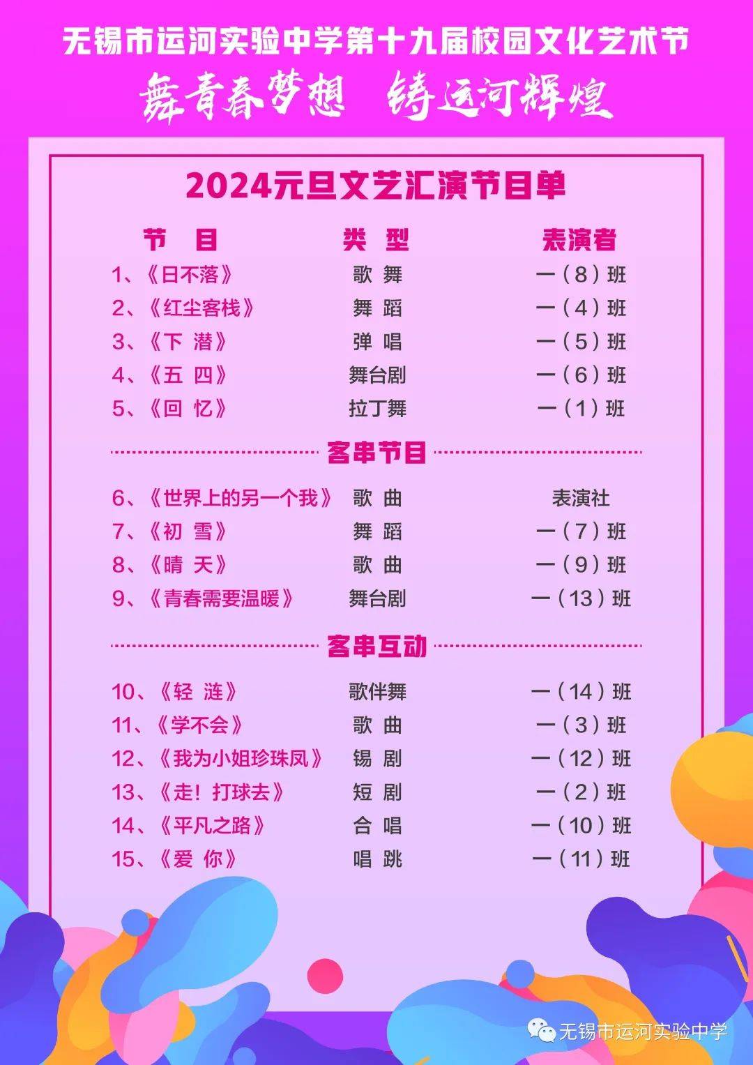 2024元旦联欢会 第十九届校园文化艺术节 2023年12月29日,无锡市运河实验中学“舞青春梦想 铸运河辉煌”2024年元旦联欢会暨第十九届校园文化艺术节顺利进行,学校领导与全体师生现场观看,学生家长通过在线直播同步欣赏这场校园盛会。 校长新年致辞
