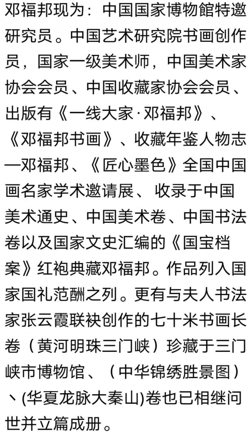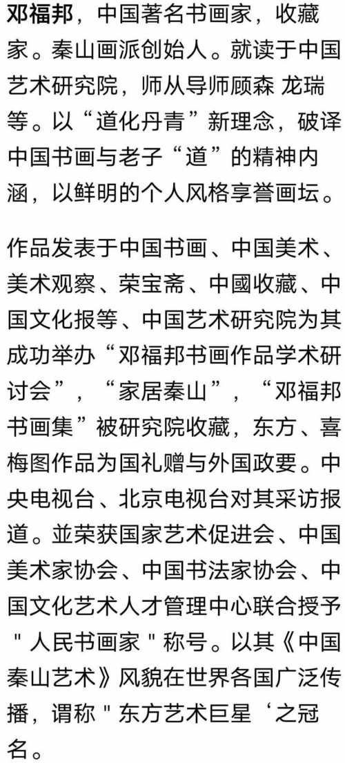 当代大秦山脉的艺术弘道者 ——记中国著名书画家邓福邦先生 作为中国传统艺术中的一大体系,丹青艺术的创作实际上已经是超越了所谓的美术范畴,因为它所强调的是画家心笔和情景的相映结合,正如古人所言画论,即传神者必以形,形与心手相凑而相忘,神之所托也。而作为当下画坛内有名的丹青大家,邓福邦先生自然也是深知这一点,所以无论是丹青艺术的取法还是为人品性的修为,他都是能够做到不趋俗,不附利,而是一直恪守丹青正脉,在运思挥毫中从容不迫,在迁想妙得中画以载道,最终一举成为了德艺双馨的艺术典范!
