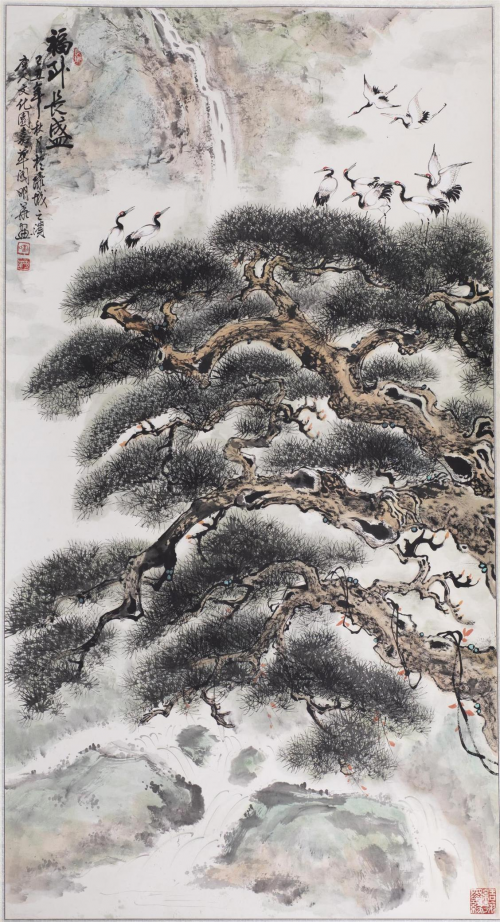 作品细致刻画了近处的古松,松的左枝向外延伸,似在躬身与客人摆手,非常亲近自然,一片宁静壮美的江山风景尽展眼前,给人以视觉上的美感和想像的丰富空间。画家刘明华深深领会到国画的要义,三分写实,七分达意,在他的古松绘画里表现得十分明显。以横陈于画面前方的一棵茂盛的松树,来彰显其古朴充满顽强生命力的特征,遒劲的枝干,茂密的松针,可见,它在岩石间是如何汲取稀薄的营养,长成参天大树的,坚毅的毅力令观者感动。松树的后面,远处天空明,群山连绵,云雾缭绕,在衬物灰淡颜色的烘托下,松树的形象愈加鲜明。表现出画家卓然不群的艺术功底。