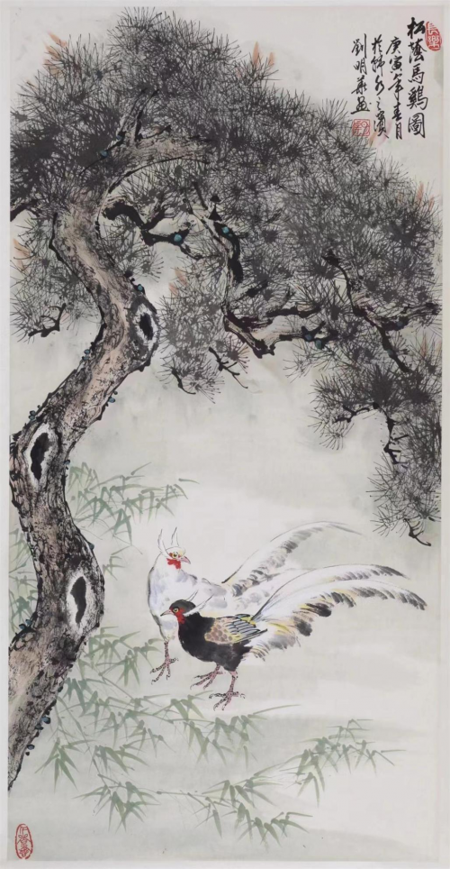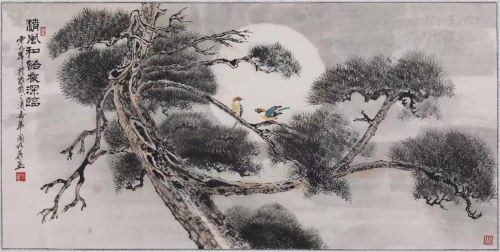 刘明华的水墨松树作品苍茫秉然,气魄沉雄,笔力老辣而稳健,墨气淋漓,其中的焦墨松树黑而透亮,遒劲恣肆,赋予了画家饱满的情感,以至人格精神的渗透与自然流露。因此他作品中的松树已经不仅是作为画面的一个构成要素而存在,而是超越了松树的点缀作用,代之而成为画面中具有核心审美价值的一种精神表达,于松树的形貌之外而能得其神理。画家刘明华的古松画作品,以恢弘气势展现了奇松傲视云海迎接日出的壮美景观。画家通过对古松的细致描绘,展现出了气势恢宏的意境,画图中远处山峰高大,近处树木青翠茂盛,古松更是栩栩如生。