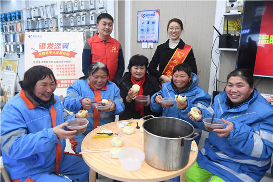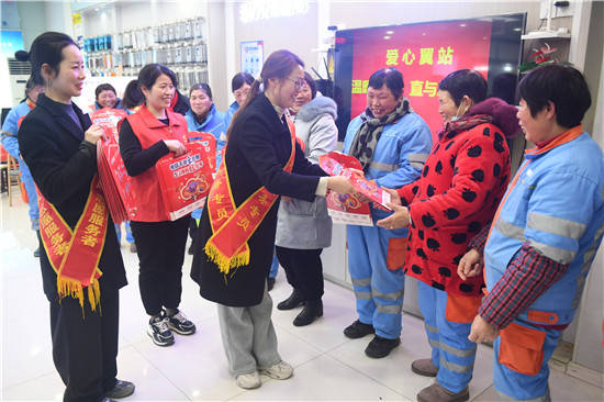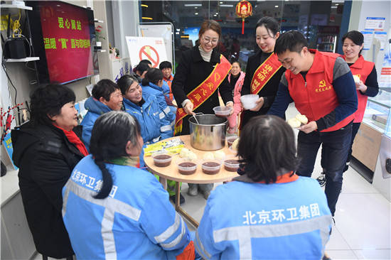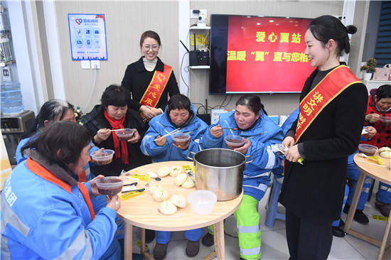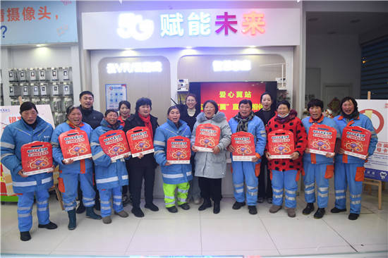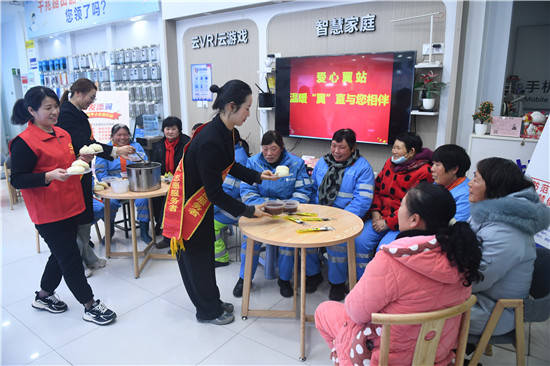 1月17日,中国电信淮安分公司开发区分局党员志愿者和营业厅“爱心翼站”的爱心专员,在“爱心翼站”为辖区环卫工人送上“浓情腊八粥”。并为环卫工人送上春联大礼包和新年祝福。