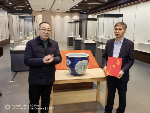 上海雅趣瓷臻文化艺术发展有限公司董事长李忠勇先生将自己收藏的清康熙蓝釉五彩人物纹大缸无偿捐赠给泰兴市博物馆。泰兴市博物馆馆长印九红表示感谢并为李忠勇先生颁发了收藏证书。