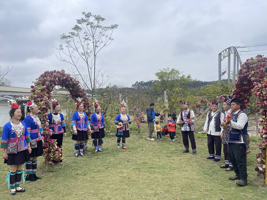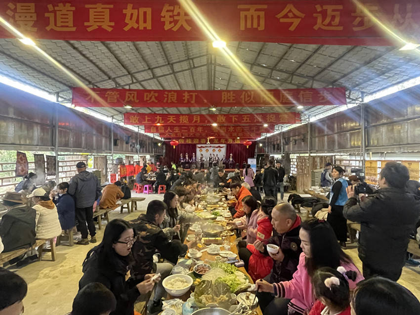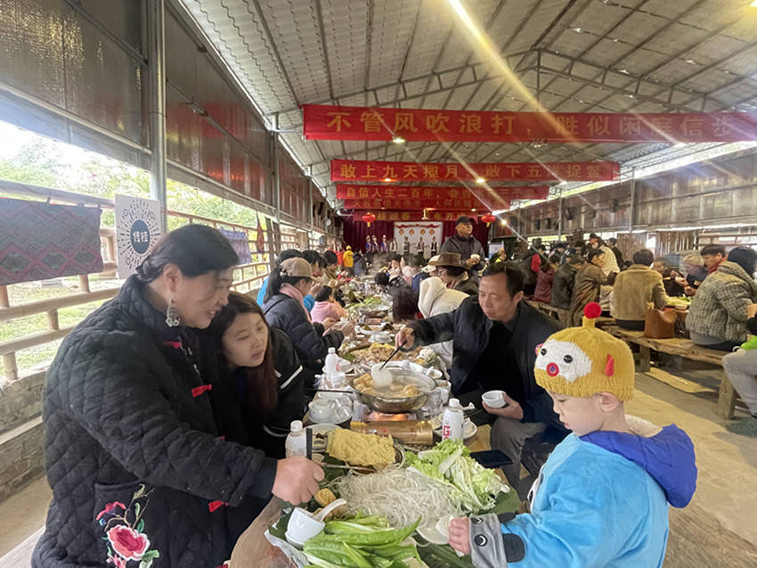 在接下来的长桌全猪簸箕宴上,身穿美丽侗乡服饰的姑娘们唱着敬酒歌分别向宾客们敬酒。侗族民族风情浓郁,人们热情好客,自古就有“无酒不成礼,无酒不成席”的规矩。《高山流水》米酒文化就是侗族文化里最著名的六宝之一。几个漂亮的姑娘一边歌唱一边为远方的客人倒酒、敬酒,歌声不停,酒水不断。动听的歌声,丰盛的菜肴,香醇的美酒,大家愉悦地品尝美食、畅叙友情、共话未来,共同祝愿彼此在新的一年里取得更加辉煌的成绩。