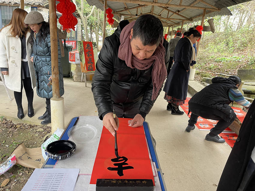 在文化长廊里,十几位书画老师正在现场挥洒笔墨,书写新春祝福 。大师们运笔如飞,笔力雄健、气韵生动,既有辞旧迎新的美好愿景春联,也有大展宏图的励志画作。在送“福”区域,书法家们个个挥毫泼墨,一幅幅象征着平安和谐、充满美好祝愿的春联和一张张笔酣墨饱的“福”字跃然纸上。除了名家送春联活动,其它的活动区域节目也同样精彩纷呈。在那里,可以聆听非遗侗族大歌,可以参与非遗扎染体验,可以亲自手制作非遗马打滚,还有非遗南宁年糕品鉴、开运香囊约体验、触球体验等等,每一个活动都是年味十足,既勾起了人们儿时美好的记忆,又能品味和了解到中华优秀传统文化的精髓。