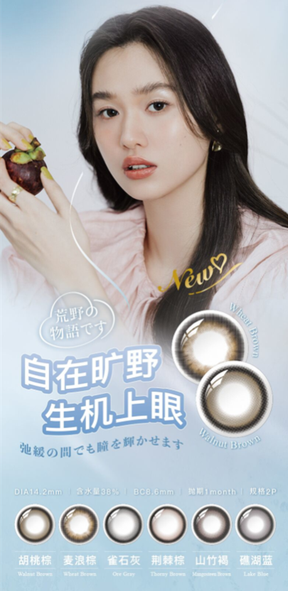 旷野物语系列彩瞳,在设计时体现了大自然属性的旷野,是生机和松弛的载体,它传递出舒适、美好、自在的信念。分为珍珠环和果实环两种锁边,聚光有神,加上珠光加持,不费力就能变美,让自然之色,尽收眼底。这个系列的色系涵盖面很广,很百搭,雀石灰、麦浪棕、荆棘棕、礁湖蓝、胡桃棕……每一款花色都独具特色,尤其是胡桃棕和麦浪棕,作为棕色系彩瞳,非常接近自然瞳色,给人一种温暖而自然的感觉,是自然的代名词,自然又优雅,独特又闪耀 麦浪棕这款花色,果实环超粗锁边,能够起到放大双眼的效果,戴上它以后,双眸星点金闪,活力迸发,有一种自然而然的深邃感。