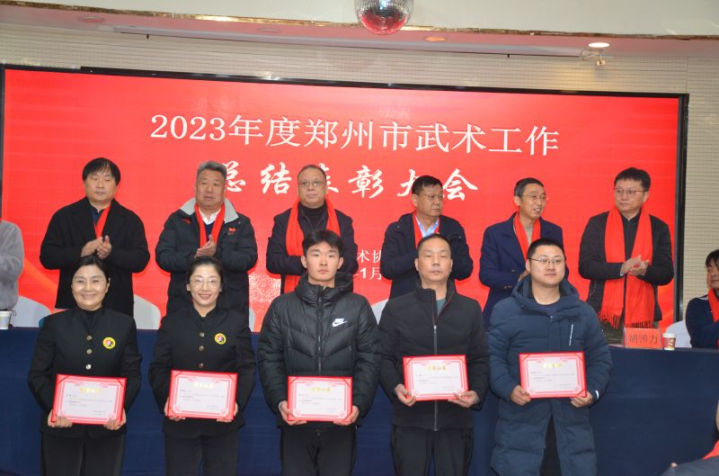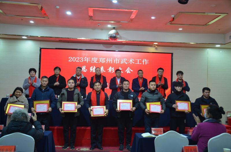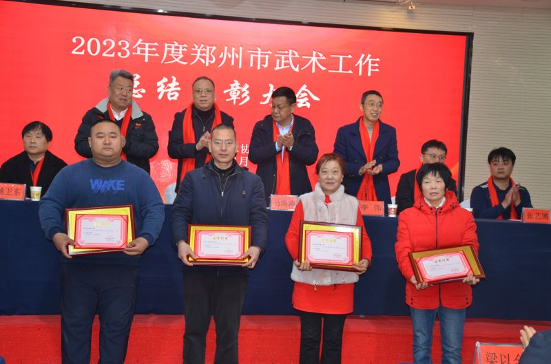 总结表彰会上,为表彰武术老前辈为郑州市武术事业做出的卓越贡献,决定授予梁以全、马春喜、刘善民三位同志“郑州市武术事业终身成就奖”荣誉称号。授予郑州市管城回族区武术协会原秘书长职洪银、郑铁养生太极拳委员会会长王爱芳等9位同志“郑州市武术事业成就奖”荣誉称号。同时,为受到表彰的先进单位、先进馆校、优秀裁判员和先进个人颁发了荣誉证书。