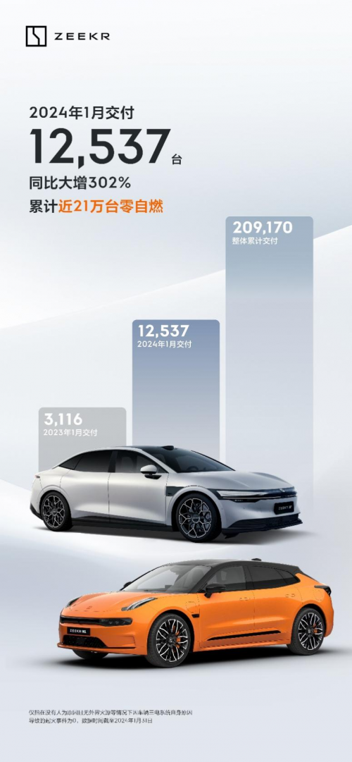 【2024年2月1日,杭州】今日,极氪智能科技公布最新交付量:2024年1月交付12537台,同比大增302%。新车型极氪007上市即交付,带动品牌势能大涨,实现新年开门红。截至目前,极氪累计交付近21万台「零自燃」,持续刷新全球电动车安全上限。