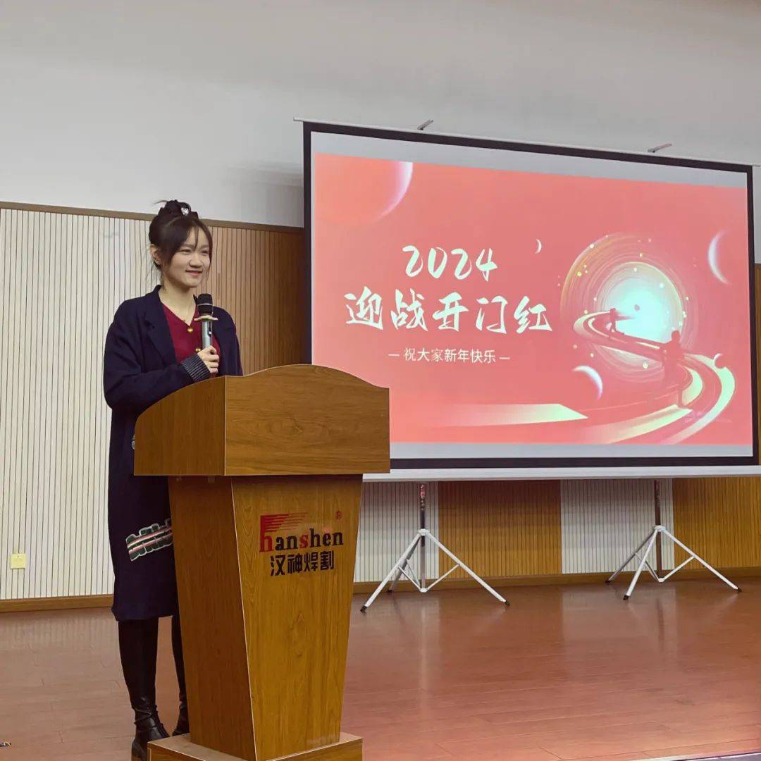 汉神金牌主持人 新年快乐 ※ 领导致辞 ※ 在这个值得纪念的年末,我们汉神大家长何总向所有辛勤工作的员工们致以诚挚的敬意和衷心的感谢。回首2023,我们积极拥抱数字化和智能化焊割变革,不断提高产品品质和生产效率,实现了产品技术水平在各焊接、清洗、切割项目中的关键突破。展望2024,我们充满信心和期待。在新的一年里,我们要更加积极主动地开拓创新,在技术和业务上进一步提升自身实力,构建更加坚实的市场竞争优势。同时,也要加强与行业优秀企业的合作,拓展国际市场,实现产业链、价值链与创新链的融合发展,实现质的飞跃。我们的销售总监刘总和技术总监雷总都针对销售、市场、技术做了相应的精彩汇报。 ※ 优秀员工表彰 ※ 公司的发展不仅要靠正确的领导,还离不开员工们的辛勤付出。在此次盛典上,我们的优秀员工代表进行了工作经验分享,同时也隆重表彰了一批优秀员工,他们在工作中不仅展现出卓越的能力,更演绎了坚韧担当、追求卓越的企业精神。他们是公司最闪耀的名片,也是公司宝贵的财富。未来的征途依然漫长,我们期待每一位员工都能以饱满的热情和昂扬的斗志,充分释放自己的潜能,积极主动地参与团队工作,加强内部合作与交流,促进良好的团队凝聚力和协作意识。只有在大家齐心协力共创美好明天的道路上,我们才能不断超越自我,成就更辉煌的业绩。 ※ 轻松时刻 ※ 今天,我们在一片欢声笑语中度过,我们也将以更加昂扬的姿态,迈出新的一步,勇敢探索焊割行业、敢为人先。愿我们共同携手,龙翔万里,赢领未来!最后,再次向大家致以最诚挚的感谢和最美好的祝福。2024年,让我们凝心聚力再出发,共同书写汉神的美好明天!