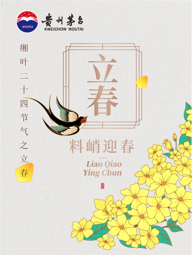 近年来,茅台一直致力于“美”的发掘、“美”的表达和“美”的推广,2024年茅台新年致辞的主题就是“以创的名义,追求美无止境”。对“东方美学色彩”的传播正是在这一背景下的重要举措。茅台集团董事长丁雄军在解释这一企业行为时表示:东方美学色彩,既是中国人领略山川日月的风雅,也是融于生产生活的诗意,蕴藏着千年的东方审美和古老智慧。因此传播东方色彩美学,“不仅是对中华传统优秀文化的一种传承,也是对东方美学极致意境的写意表达,传递的是一种对生活的态度和追求。” 茅台报时表盘上的文化内涵 如此万众瞩目的时刻和资源,茅台却给了代表中国传统农耕文明的“二十四节气”。自2022年起,“贵州茅台节气报时”上线,跳出单纯品牌展示的模式,而是让观众把注意力放在“节气”以及附着于“节气”的文化内涵上。即用中国美学表达“中国时刻”,用“中国时刻”传递“中国名片”。 二十四节气是中华民族农耕文明的智慧结晶,它深刻影响了国人的劳作规律和生活习惯,并以此产生丰富深邃的节气文化。农耕节气自然与酿造也息息相关——小麦熟、高梁收,端午踩曲、重阳下沙,都是酿造与农收密不可分的重要时刻。 正因为如此,自2022年开始,茅台不断创新表达二十四节气文化,在每一个节气都推出具有特色的文化活动;并在2023年开发出二十四节气酒,致力于打造和传播茅台品牌独有的二十四节气文化IP。而此次缃叶美好生花系列在“贵州茅台节气报时”的推出,无疑是对这一IP的进一步深化和推广。 迎春花唤来“春消息” 此次贵州茅台的报时表盘上,迎春绽放,双燕归来,在一片东方山水中宣告“立春”节气的到来。 立春是二十四节气中第一个登场的节气,所谓“律回岁晚冰霜少,春到人间草木知。” 迎春花就是最早“知春”的草木之一。立春三候:一候东风解冻,二候蛰虫始振,三候鱼陟负冰。立春时节,春寒料峭,但河水已经开始解冻。田间地头、房前屋后,一丛丛迎春花用她娇嫩的黄色最先报告春的消息。