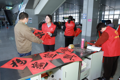 送暖心祝福。翰墨飘香,真情送福,该行青年志愿者与团区委志愿者一道,为高铁站返乡旅客送温暖祝福,现场写春联,送“福”字,把新春美好祝愿带回家。