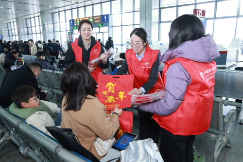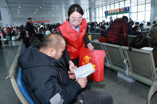 送保暖礼包。该行青年志愿者为返乡旅客送上口罩、姜茶等保暖物品礼包,让他们在返乡途中,一路温暖。