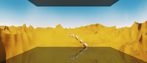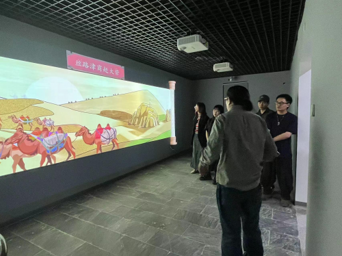 天津瓷艺园新媒体项目《赶大营》现场3 本项目项目将从历史事实出发,以科技艺术作创作媒介,将爱国主义作为思想内核,重现赶大营时期先辈们所历经的艰难险阻,描绘沿途祖国大好河山的壮丽景色,讲述其重大的历史意义以及对后世带来的深远影响。在技术手段上运用3Dmapping投影打造出沉浸式体验空间,设计交互环节,观者通过触摸画面可聆听作品中的人物讲述历史故事,以“沙漠寻宝”等交互游戏形式来吸引广大观众的参与,起到公共教育的作用。目前该项目已经落地运行。