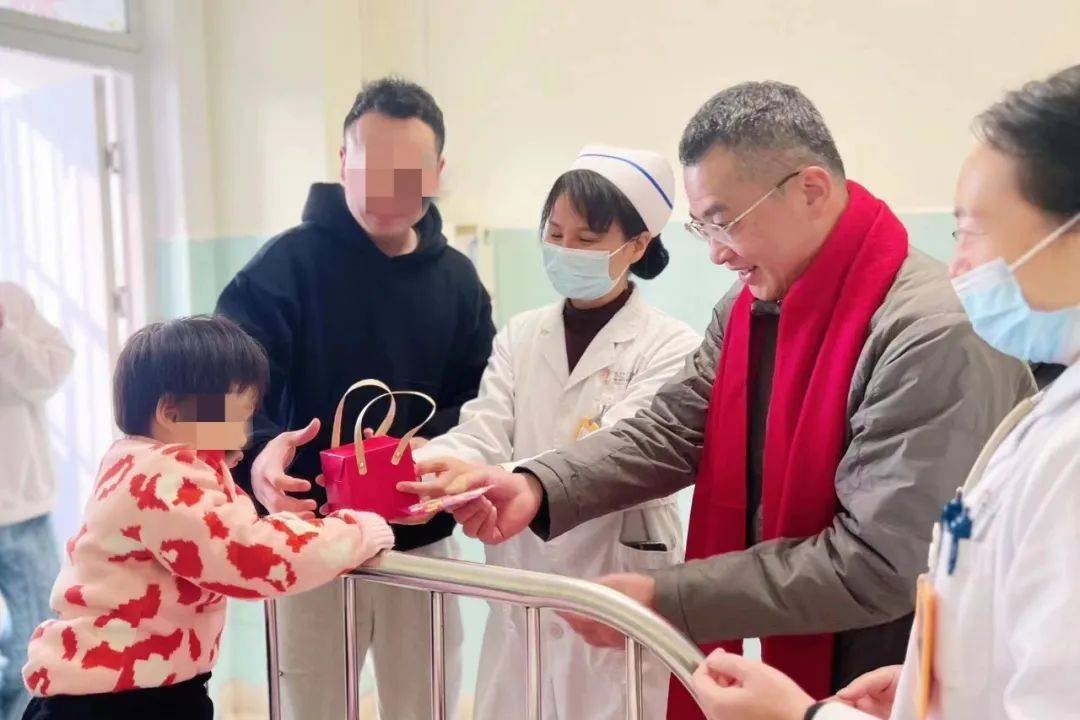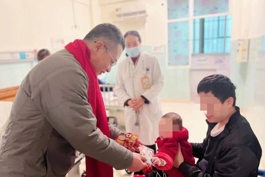 彭百承副院长一行为患儿送祝福 大年初一,副院长彭百承一行走进病区,为春节不能回家过年的患儿送上新春的祝福和新年礼物,让患儿在病房也能感受到浓浓的节日氛围和如家般温暖。