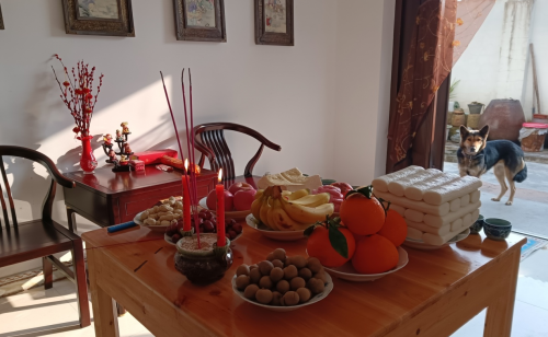 拜菩萨有荤拜和素拜之分,你见供桌上敬奉着鸡、肉、鱼者,那是荤拜。我家则多为素拜,敬奉的供品清一色素食,像年糕、豆腐、糕点及香蕉、苹果、橙桔、红枣、花生、桂圆等,没沾半点荤腥。酒水也采用洁净溪水烧出的白开水。 童年的印象中,我外婆吃斋念佛。外婆拜菩萨,祭祖宗的日子多数放在腊月三十日。每当安排就绪,外婆表情严肃地让我到供桌旁,指点我跪拜,她的口中不停念叨“顺顺利利,健健康康”等吉祥语,这样的熏陶,潜移默化给我童年的内心播撒下底线和敬畏的种子。母亲慎终追远的观念很强,她完整继承了祖辈传承下来的拜菩萨、祭祖宗习俗。上世纪在大西北生活、工作的岁月里,依旧保持祭祖的习俗,形成祖宗虽远,祭祀不可不诚的习惯。在那些年代,每逢祭拜,母亲总让我承担迎请和回香的工作,我总要东张西望一阵子,希望我的行动不要被路人发现。如今,我的妻子开始逐步将这一带有浓重文化色彩的老习俗传递到儿媳手上。屈指算来,前后也已传承了四代。