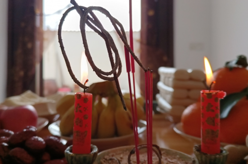腊月里,拜菩萨,祭祖宗要放在同一天完成,即早上拜了菩萨,下午接着要拜祖宗。拜祖宗时可以重复使用早上拜过菩萨的水果类供品,而菜肴、主食等供品要另外做,主要是选择几道祖宗们生前喜爱吃的食品。母亲对她的大人们喜欢吃的饭菜记得很牢,于是从食材选购到下厨烹烧,都做得极为细致。当年,只要我在母亲身边,迎请祖宗的任务都由我来完成。母亲亲手点燃三支香后交给我,便一再叮嘱我,记住!大人包括乔葛岙的太公、太婆,公棠的太外公、太外婆,入山亭的太外婆,还有爷爷、奶奶,外公、外婆……一个都不能落下,都要请到。我便手捧香火,很虔诚地站在大门之外,面朝祖宗们所在的方向,在心中默默地挨个呼唤:“新年临近,请太公、太婆,太外公、太外婆……来家里吃饭。”随着香火插进香炉,祖宗们都已“落座”,母亲便轻声念叨,细细介绍各类菜蔬:“娘娘(对奶奶的称谓),这道菜侬意向欢喜吃,多吃点啊。爸爸,这道菜炖得很绵软,侬原来很要吃,多吃点啊……”。 其实,祭祖的习俗在中华文明的历史长河中,早已传承了五千年。司马迁在《史记》中记载,轩辕黄帝本人非常敬畏大自然,他对祭祀无比重视,曾经常开展规模很大的祭祀活动。轩辕黄帝还能把握顺应天地自然四时节气的规律,教导百姓依照日月星辰的运行展开生产劳作,以避免遭受风火水土等天灾的危害,可见我们先祖的大智慧。 祭祖比拜菩萨用的时间更多,请客的诚心与人间一致,要续香、要添饭、要斟酒。过去,为祖宗添饭、斟酒总是由父亲记着,他在操作中很小心,生怕因身体“碰撞”到祖宗们而影响到他们的用餐和聊天;父亲添酒时还恭敬地劝着祖宗:“今天时光还早,不要性急,慢慢吃,多吃点,多聊会。”祭拜的过程要酒过三巡,饭添三次。最后全家人还要挨个再在拜凳上拜拜,祭祖活动也就接近到尾声。回香时,子孙们还要焚烧早已为祖宗们准备好的纸钱和经文。