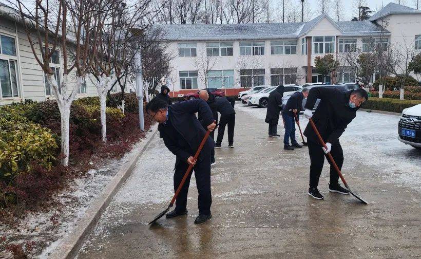 区级机关大楼的干部职工开展扫雪除冰志愿服务活动,对办公区域、行车通道的冰雪进行清扫清理,为办事群众提供便利。