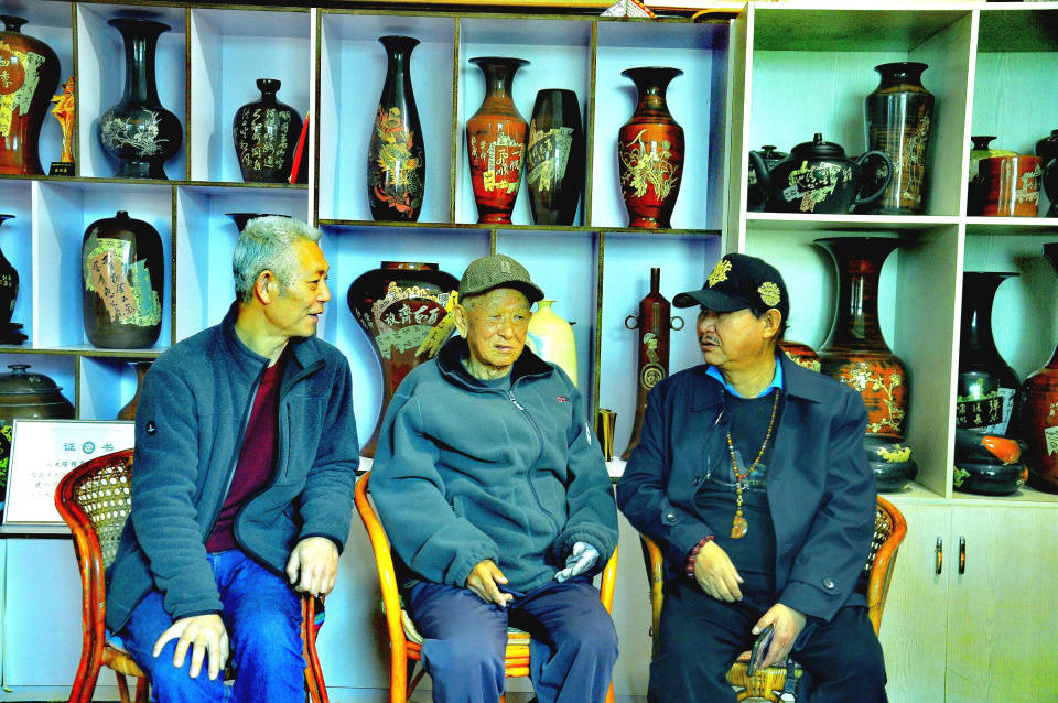 [图3• 左起:中央数字电视摄影频道红河站副站长王伟、中国工艺美术大师,中央数字电视摄影频道艺术指导陈绍康先生、中央数字电视摄影频道红河站站长纳本良亲切交谈,并商讨了接下来红河站工作的开展]