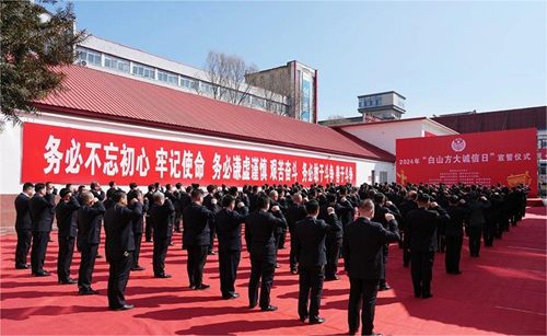 在六楼会议室、白山方大集团院内,来自集团各个岗位的员工举起右拳,郑重宣誓:高举诚信品牌,捍卫诚信尊严,恪守诚信承诺,履行诚信义务,追求顾客满意,保证商品质量……铿锵有力的诚信宣言响彻云霄。