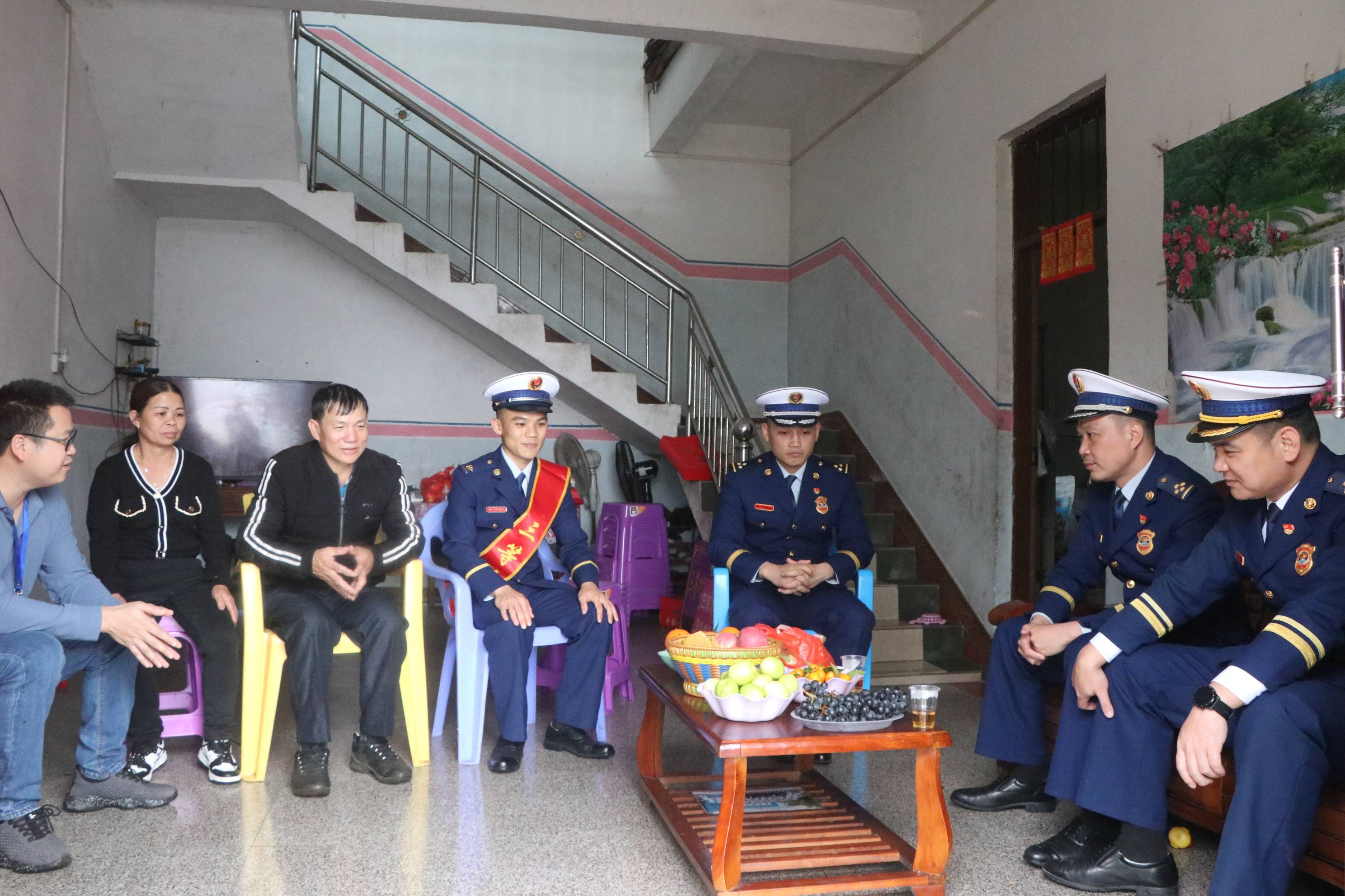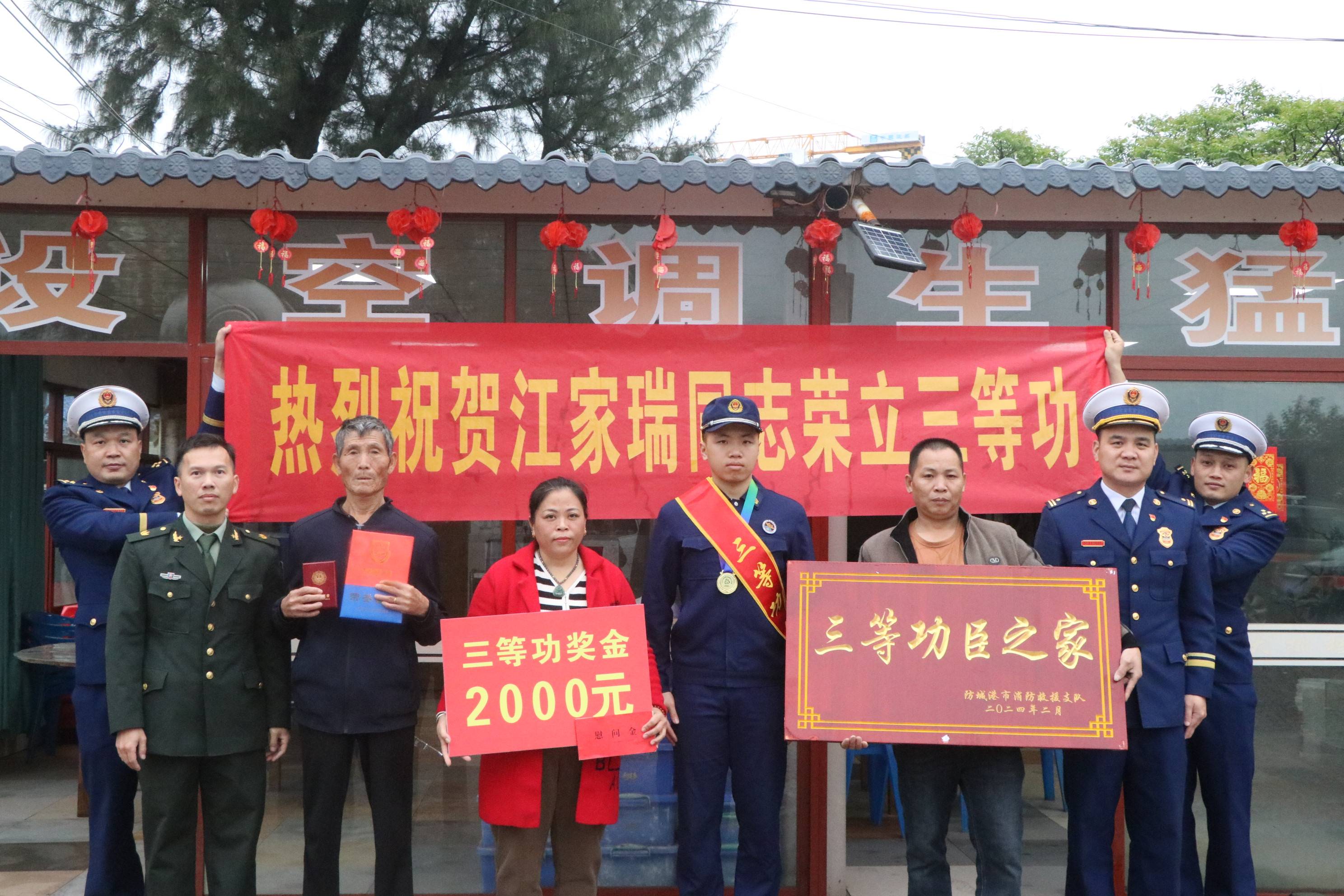 3月14日上午,防城港市消防救援支队联合防城区人民政府、防城区武装部、退役军人事务局、应急管理局等部门组织开展“送奖到家”活动,为在2023年度工作中表现突出、立功受奖的陈凤辉、江家瑞两名指战员送去祝福和关怀。