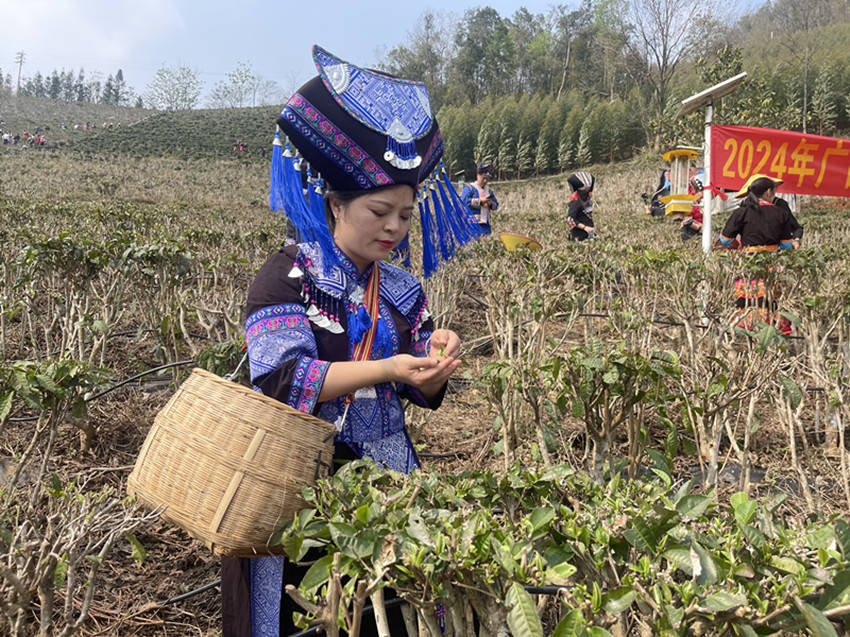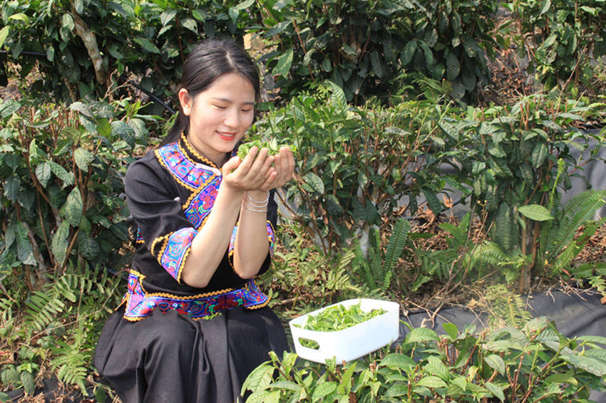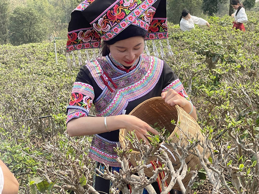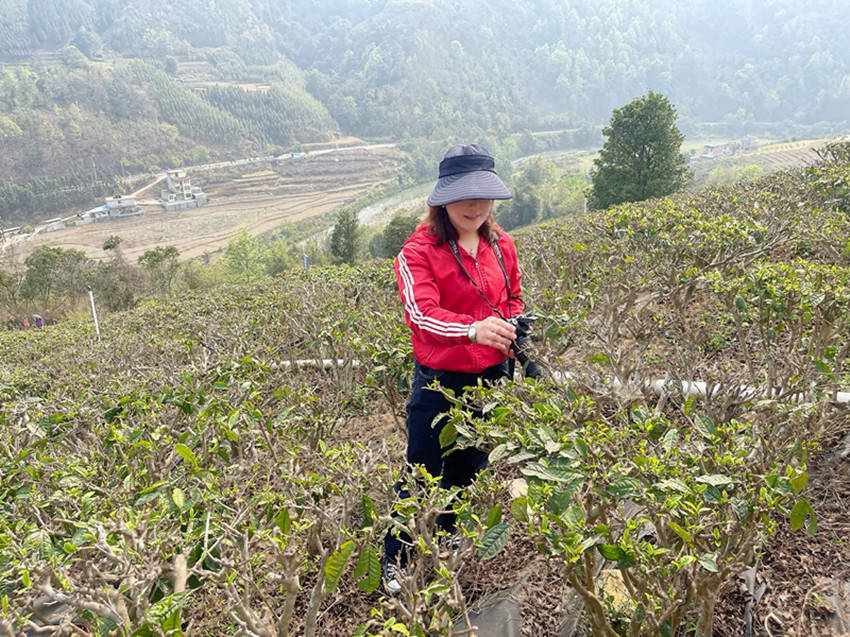 国家一级演员,百色市歌舞团著名歌唱家黄依兰亲自体验采摘茶叶。