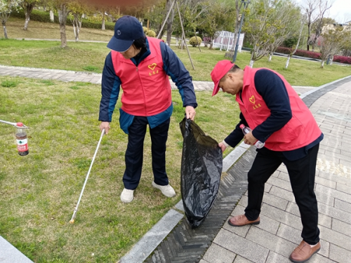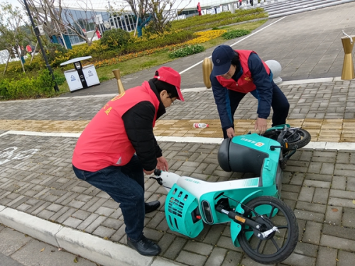 当天,10位党员志愿者从余姚新时代文明实践中心出发,途径玉皇山公园,抵达余姚市公共文化中心。沿途,他们带着垃圾夹和垃圾袋,一路捡拾玉皇山公园角角落落的塑料瓶、烟盒、烟蒂等垃圾,并在马路上扶送老人过斑马线,沿途中两名党员志愿者还发现几辆共享单车倒在马路边,就立马把它扶起放好。