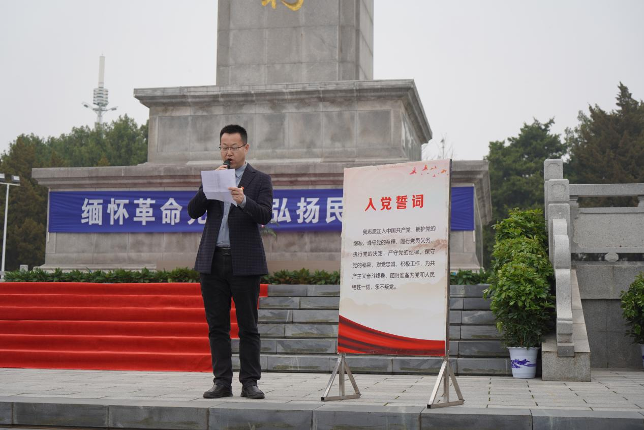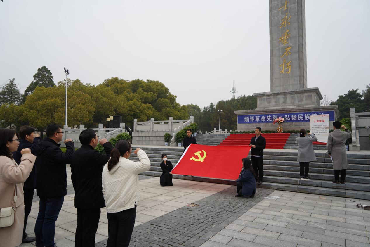 淮安区烈士陵园内松柏青翠、清风徐徐、庄严肃穆。全体人员来到烈士纪念碑前敬献花篮、重温入党誓词。纪念碑体犹如冰冷的钢枪直指蓝天,诉说着烈士牺牲的悲壮故事,纪念碑前,全体党员无不怀着崇敬之情庄严肃立。随着音乐响起,马超和金辉两位同志将花篮抬至纪念碑正前方,卢松和姜宗康两位党委委员上前整理缎带,全体党员同志庄严肃穆,鞠躬默哀,缓步把一束束鲜花安放在烈士纪念墙,向烈士们致以深深的怀念和敬意。随后,面对鲜红的党旗,王婷同志带领全体党员紧握右拳,重温入党誓词:“我志愿加入中国共产党,拥护党的纲领,遵守党的章程……”。